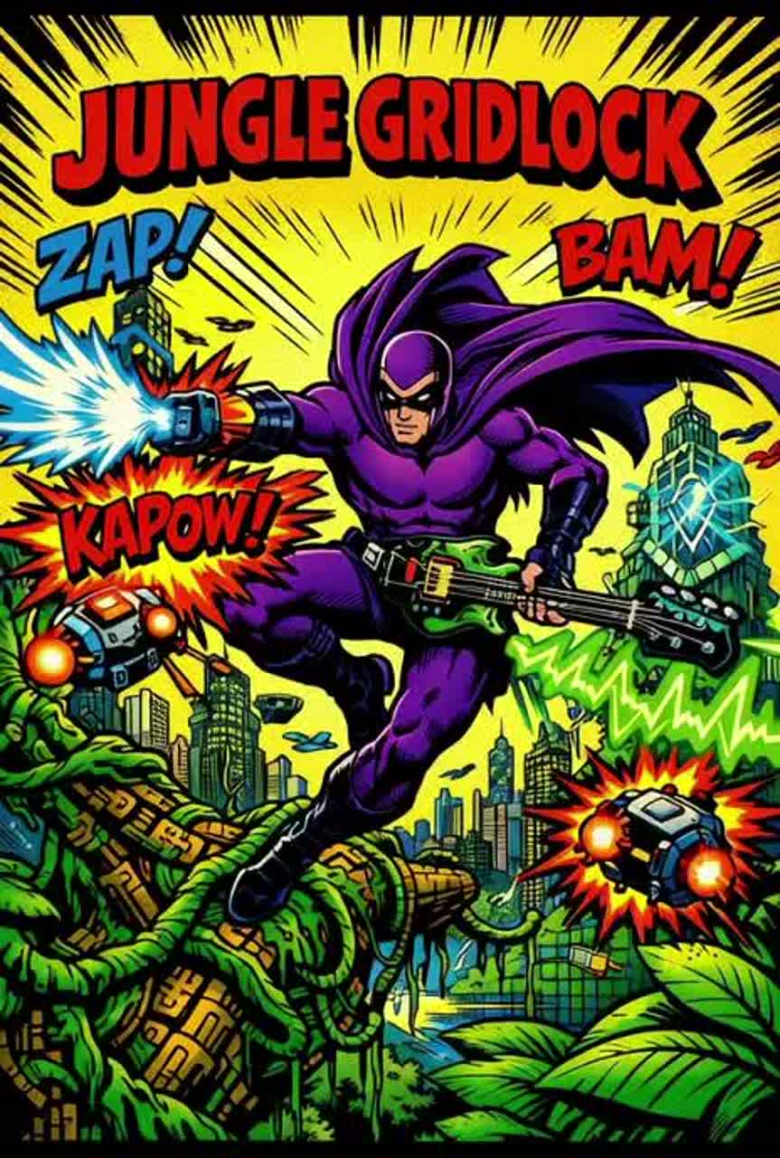 134 BPM synthwave retro x electro 80s x jungle hybrid in F#m evoking Phantom 2040 cyber-jungle comics