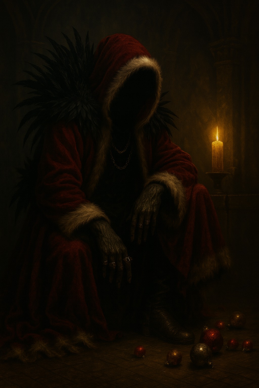 Christmas jingle, sleigh bells throughout, upbeat, dark alt-r&b, cinematic dark-pop, Sleep Token (Leo Faulkner) low-baritone resonance, seductive close-mic vocals, breathy lows, sudden dynamic jumps, festive-but-haunting Christmas instrumentation, metallic sleigh bells, deep tom pulses, distorted glockenspiel, low choirs, icy synths, crisp jingle-bell triplets, halftime switches, surprise gospel-hint chords, emotionally tragic holiday atmosphere}], ‑Female Vocals, ‑Orchestral Strings, ‑Acoustic, ‑jazz, ‑80s, ‑ballad, ‑African vocals, ‑vocal ad-lib intro, ‑vocal fry, ‑R&B, ‑strained belting, ‑gritty vocals, ‑glitch, ‑screaming, ‑screamo, ‑black vocals
