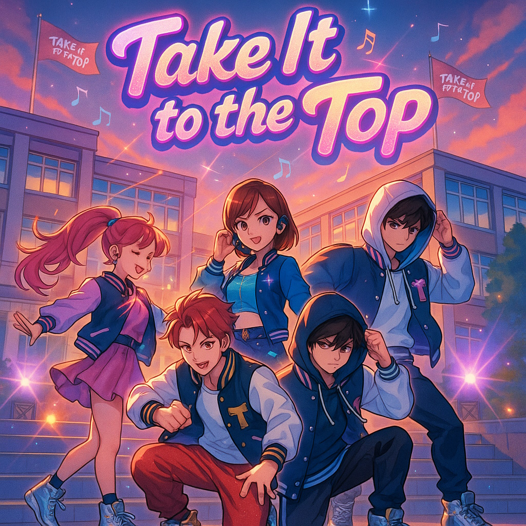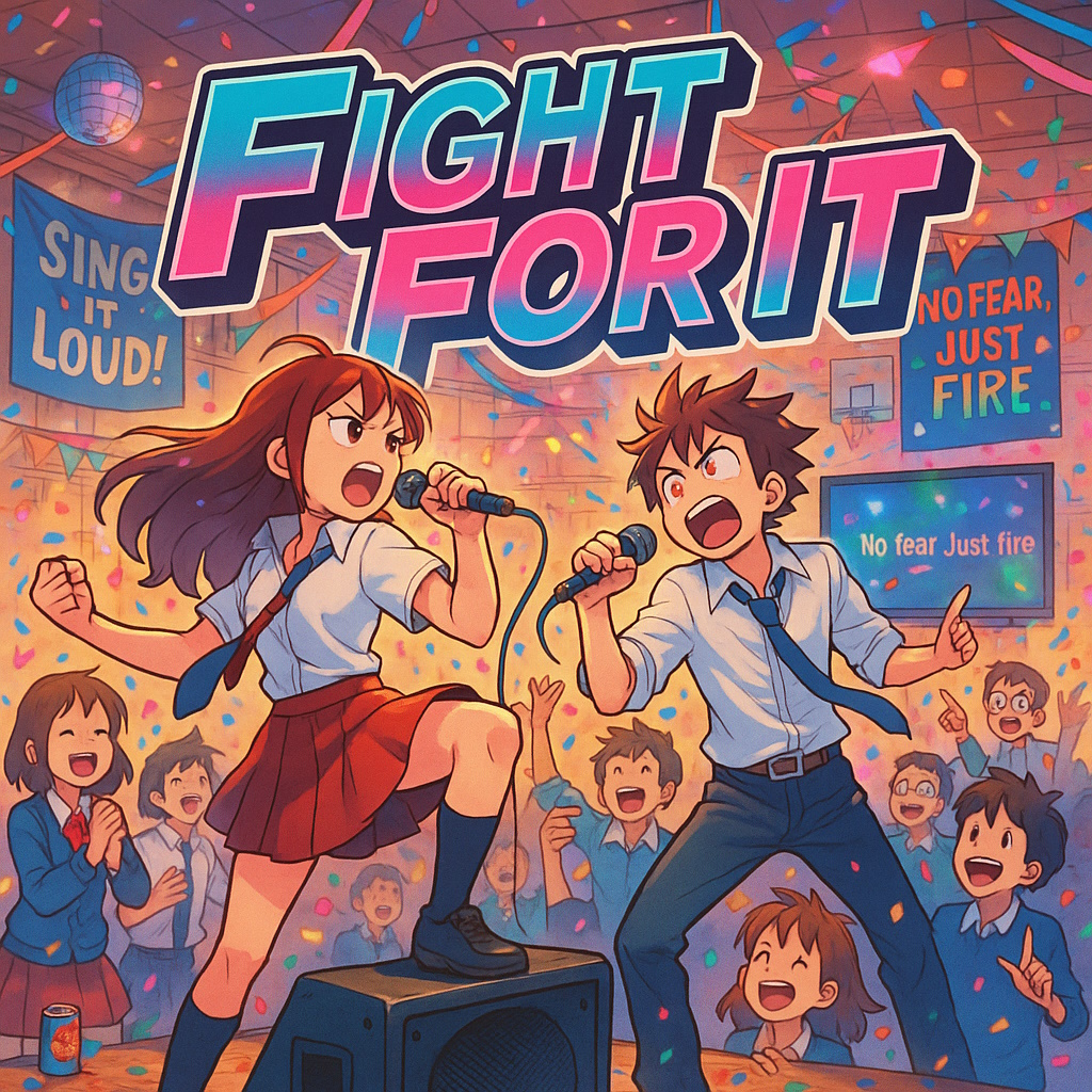 a high-energy K-pop rock anthem with dance-pop flair, blending electric guitar riffs, synth stabs, stomping drumlines, and layered group vocals, The verses alternate between fierce female vocals (power, clarity) and passionate male vocals (raspy edge, clean pop tone), with surprise lines shouted or sung by background characters for a live, ensemble feel, The chorus explodes with harmonies, crowd-style chants, and stomping beats, all layered over a pulsing bass rhythm and guitar-driven hooks, The bridge features vocal callouts, claps, and stomps, followed by a massive final chorus with full vocal layering, all mixed with rhythmic dance energy and school-performance spirit, Voice tags include: female (bold mezzo, sweet high tone, rapid rap), male (soft pop, gritty belting, crowd chant), all trading lines in a dynamic, layered production