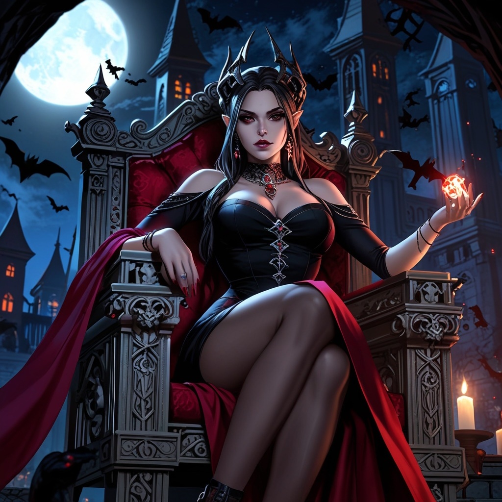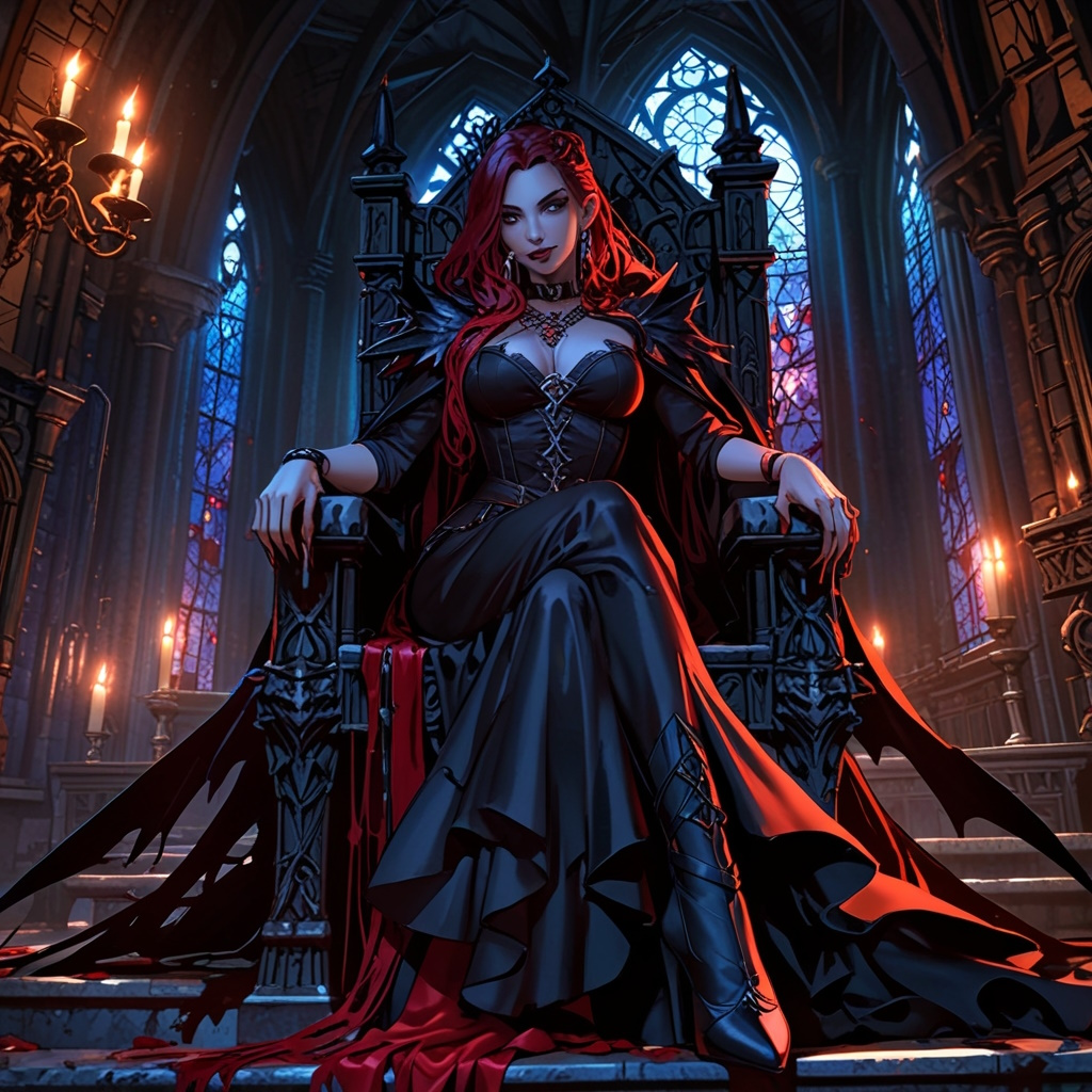 A dark cinematic rap opera with powerful female lead vocals and deep male backup chants, The music blends gothic orchestration (strings, choir, pipe organ) with intense hip-hop drums and ominous synths, The structure follows a dramatic story arc, rising with tension and fury, The female voice commands like a queen — fierce, elegant, and ruthless — while the male voices chant and echo her lines in sinister harmony, The instrumental includes shifting dynamics: quiet whispered sections, thunderous war drums, and sweeping orchestral moments, Perfect for a vampire queen rising to power in a world of betrayal and blood, Emotional, theatrical, and deadly