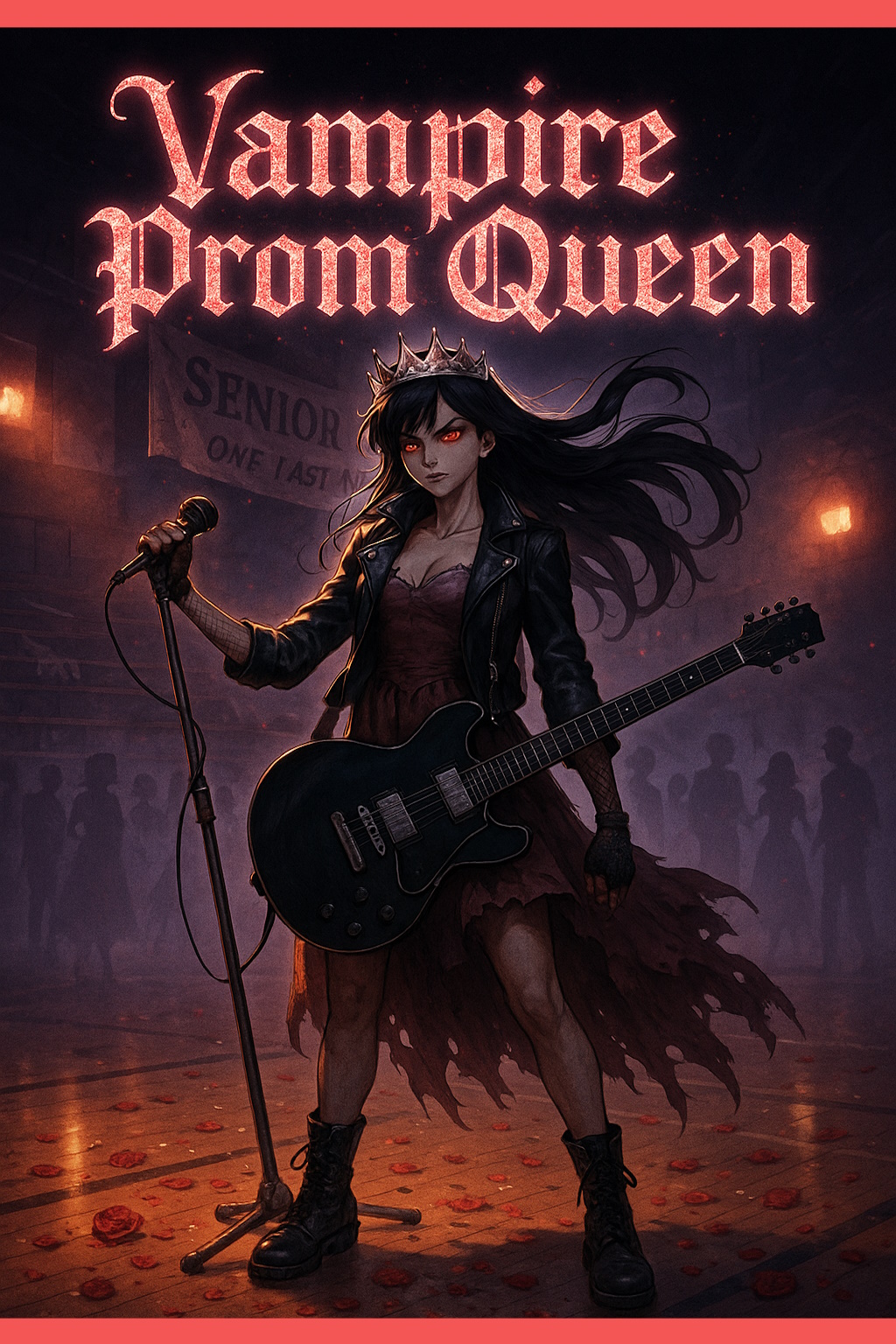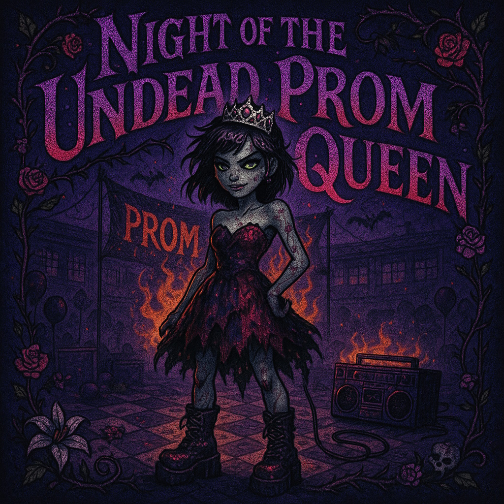 Upbeat and edgy teen pop-rock track with powerful female vocals, Features catchy electric guitar riffs, stomping drum beats, tambourine hits, and handclap rhythms layered over a rebellious rock and roll backbone, Include a cheeky, confident bassline and rhythmic breaks that feel like secret signals passed in a haunted high school hallway, The vocal delivery is bold, flirty, and sinister — like a prom queen risen from the grave to reclaim her crown, Add layered harmonies in the chorus and a spooky breakdown section in the bridge with a whispered spoken line, The overall vibe is fun, fierce, and undead — a homecoming anthem for the living and the damned