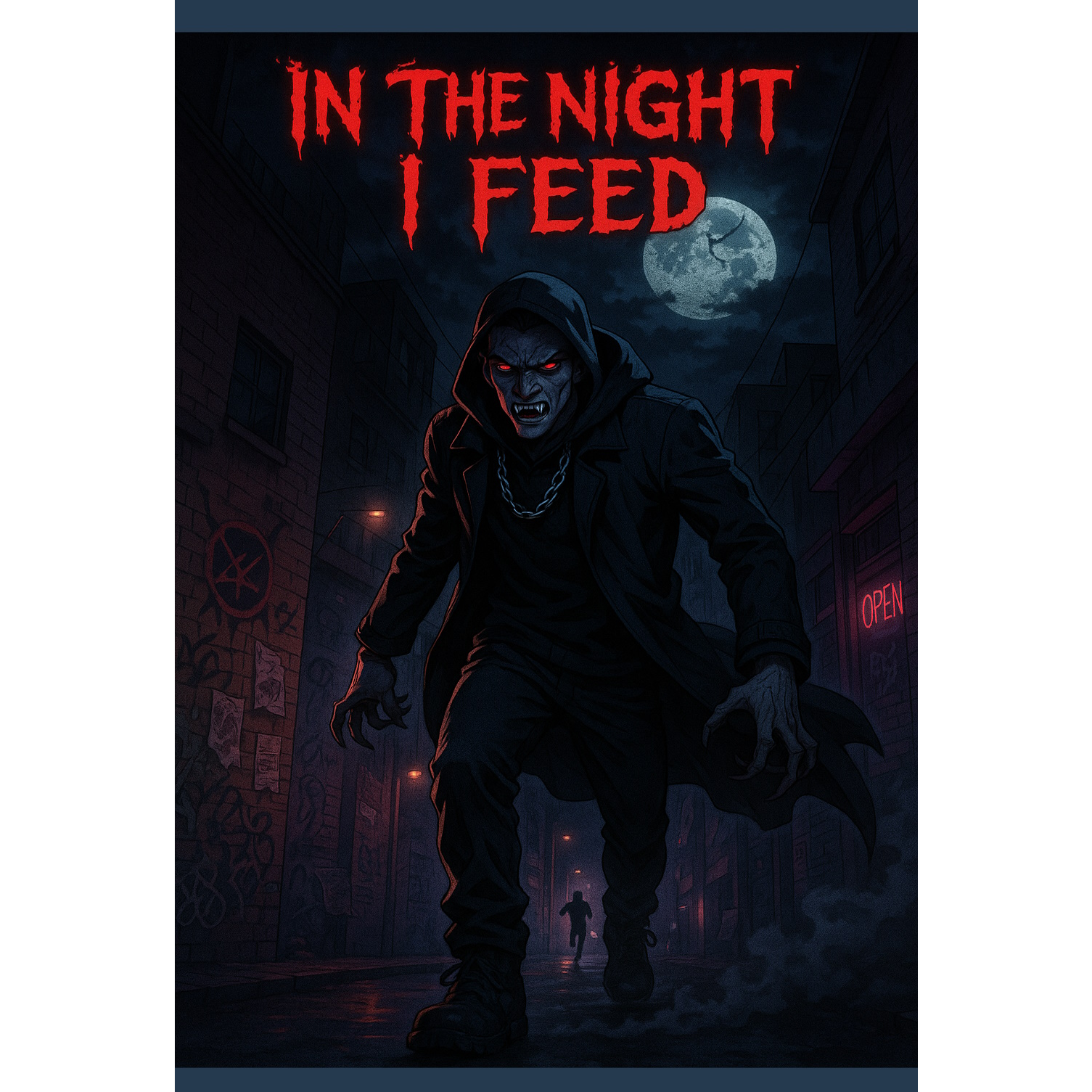 Aggressive rapcore anthem with fierce female lead vocals delivering rapid-fire verses and a powerful, screamed chorus, backed by heavy distorted guitar riffs, deep bass, and pounding hip-hop infused drums, Dark cinematic strings and eerie synth pads weave through the mix, adding a gothic vampire-horror atmosphere, Vocals alternate between sharp, rhythmic rap delivery and soaring, aggressive screams, with layered harmonies in the chorus for impact, Tempo is fast and relentless, with breakdown sections featuring chugging guitars and echoing snare hits before exploding back into full energy, The mood is predatory, dangerous, and unstoppable, evoking the hunt of a vampire queen who fears no one