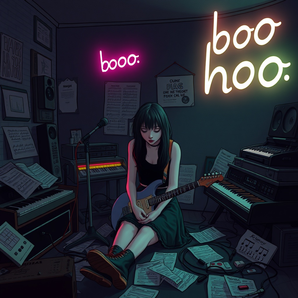 Experimental indie rock / darkwave pop / electronic satire, 120 BPM, Instrumentation: lo-fi electric guitars, distorted bass, layered synths, glitchy electronic percussion, ambient textures, subtle vinyl crackle and glitch effects, Vocals: female, sardonic, dry humor with emotional cracks, slightly melancholic yet witty, Include sarcastic spoken outro over fading glitchy ambiance, Catchy, ironic, relatable, self-aware tone