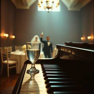 Intimate chamber-pop / indie-folk tragedy at ~92 BPM: slightly detuned upright piano and subtle “wedding mic” room reverb, with fork-on-glass and glass-clink foley, Verses are breathy and controlled, delivered like a practiced toast; the chorus lifts into swelling strings and restrained drums with a kick that pulses like a nervous heartbeat, Female lead vocal with crisp diction and tightly held emotion that finally cracks on the bridge highs, The outro drops the band into raw room ambience and mic feedback for a dry spoken toast, then a fading sung confession