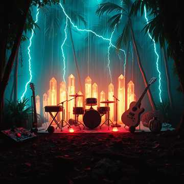 hyper Brazilian tribal electronica, chimes, pan flute, glass drums, crystal synthesis, backwards loop scratching, harmonic oscillating guitar, ocean machine delay, deep industrial, spoken in prayer, make and female vocals, cinematic undertones and sounds of the jungle, ends in dramatic lightning crashes