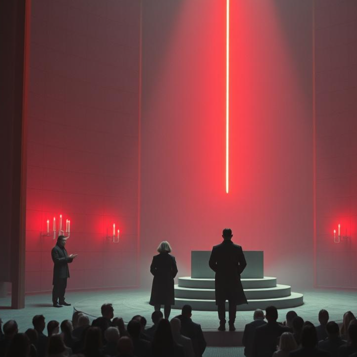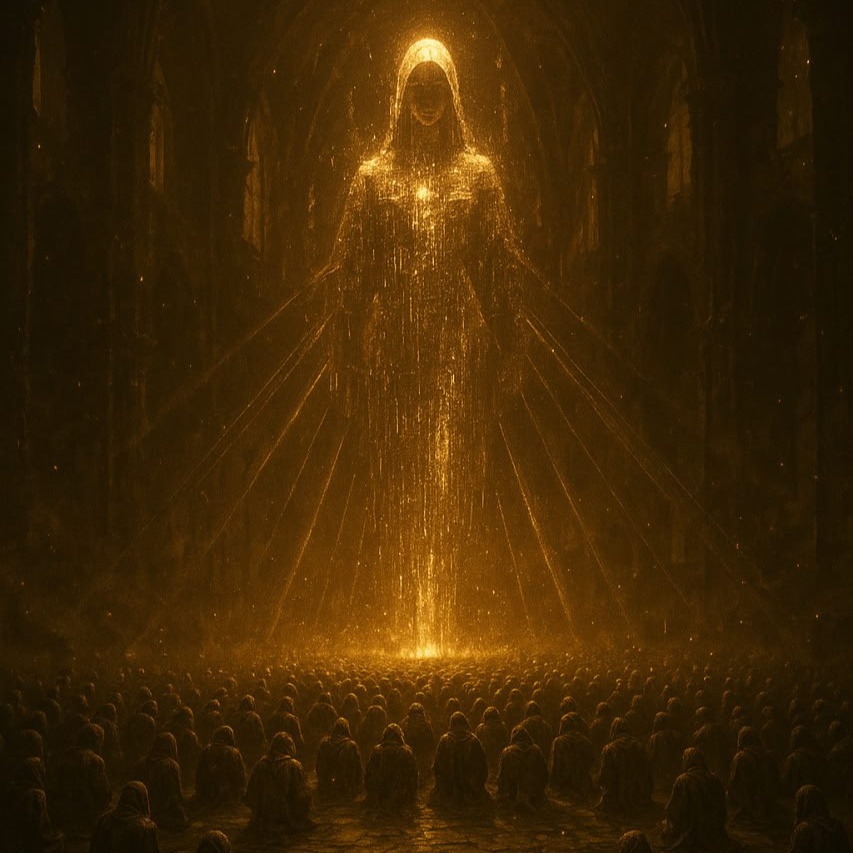 Dark Tribal Electronica, industrial hymn, ritual chanting, apocalyptic choir, gothic dystopian electronica — deep drones, mechanical percussion, ominous synth pads, layered male drones and ethereal female vocals, reverb-heavy cathedral atmosphere, fanatical and worshipful tone, hymn-like structure with chants, call-and-response, ecstatic crescendos, and fading whispered outro [vibes: blind devotion, ominous, oppressive, ritualistic, cult-like, glitchy, technological]