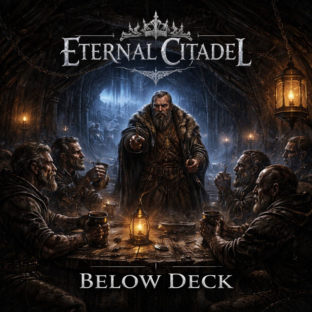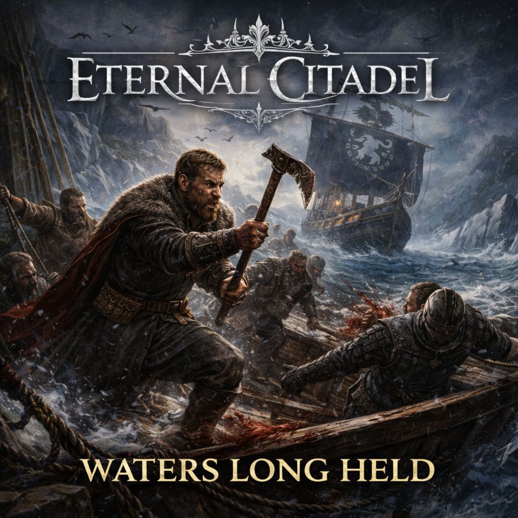 Uptempo epic metal song with strong forward momentum, Driving drums with a steady gallop feel, Tight, rhythmic rhythm guitars and a cold, minor-key riff, Clean, powerful male vocals with a commanding tone, Group shouts and layered backing vocals to represent multiple voices, Strong verse-to-chorus contrast with a forceful, memorable refrain, Maritime and northern atmosphere, working-class grit, Confident, authoritative bridge section led by a commanding voice, Energetic and propulsive, raising intensity after an atmospheric opener