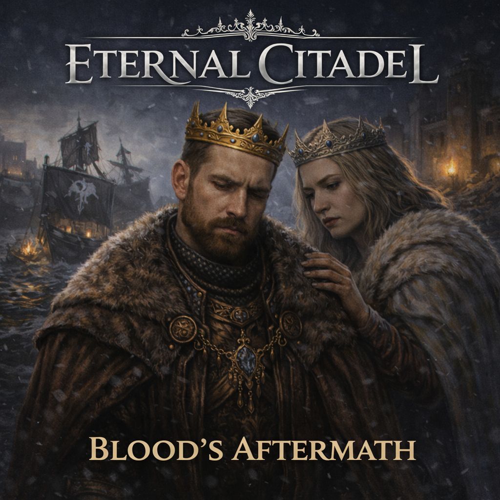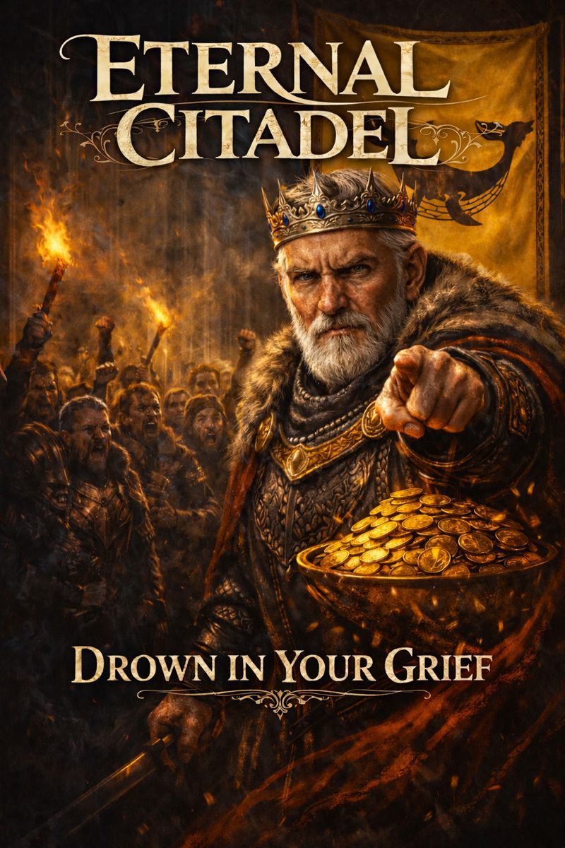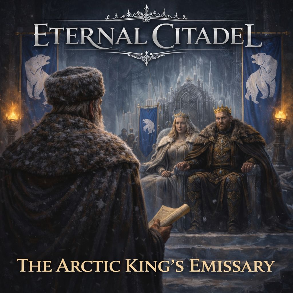 Epic metal song with a cold, northern atmosphere and strong forward momentum, Opens with a short Nordic-inspired instrumental section using low strings or folk-style melody over steady percussion, Instrumental intro transitions quickly into an energetic uptempo metal groove, Driving drums with tight, disciplined rhythms and bursts of double-kick, Sharp, aggressive rhythm guitars in a minor key, Clean, commanding male vocals with a controlled, authoritative delivery, Clear contrast between emissary verses and the king’s forceful responses, Focused, punchy chorus that locks in rather than explodes, Cinematic and tense, building toward restrained but unmistakable threat