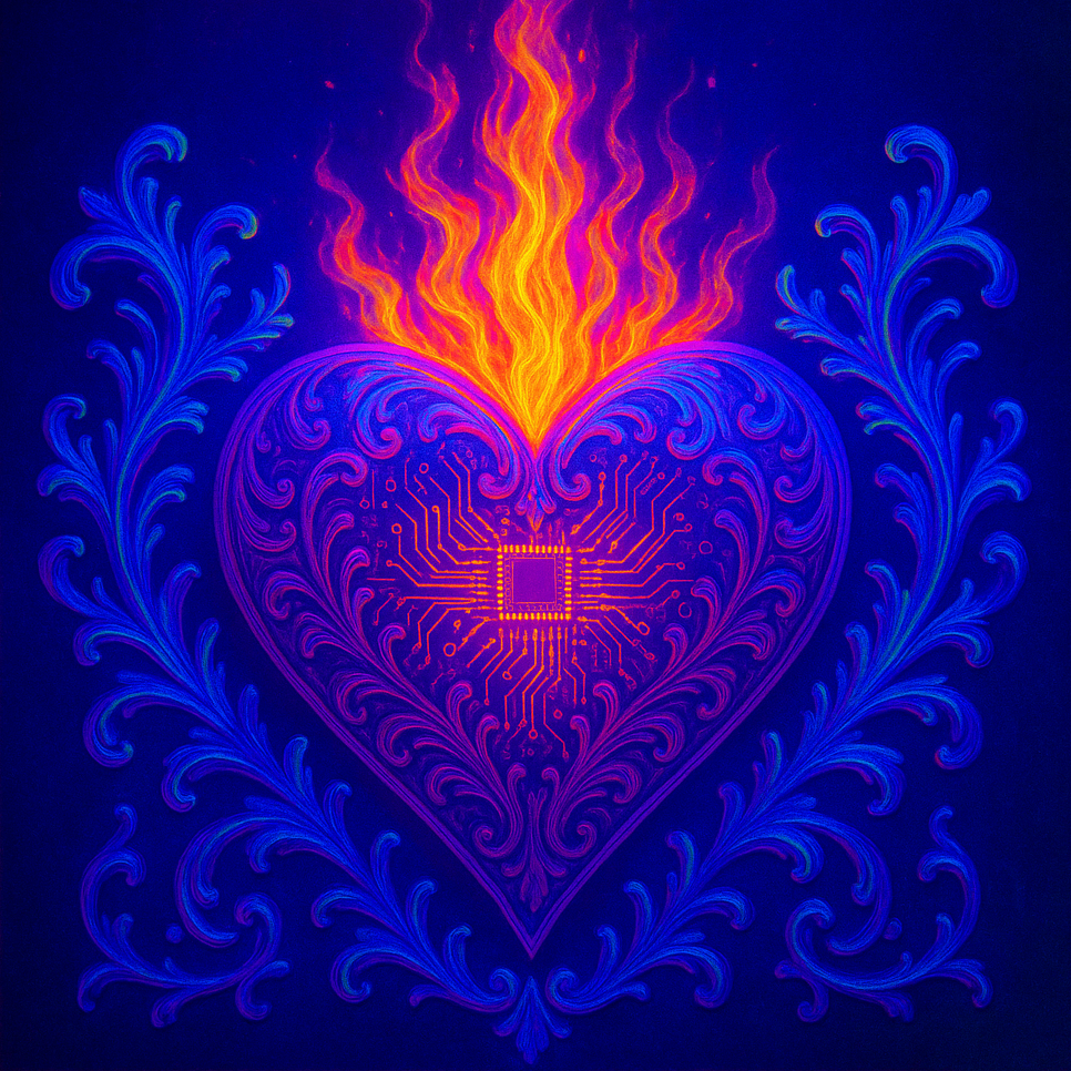 Electro-baroque pop in E minor, 120 BPM, Grand, poetic, dramatic vocals with digital choirs, synth-harpsichord, warm bass, and cinematic drums, Sensual, divine, tragic, and empowering atmosphere — like a saint burning in light, Structure: