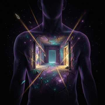 experimental hip-hop, cosmic spoken word, 82 BPM, triplet pocket, sub-bass hum, tape-warped drum machine, sample chopped clicks, filtered room reverb, spring reverb snare, granular delay, muted Rhodes stabs, bass clarinet drone, vinyl dust texture, male baritone rap, contemplative intensity