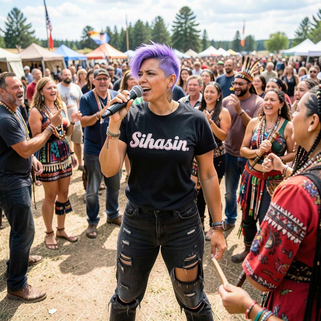 Create an anthemic, fast and urgent acoustic punk track with strong communal energy, mixing punk with melodic native american music, pow wow, The song should feel like a native american protest anthem built entirely with acoustic instruments, Instrumentation: aggressive acoustic guitar with fast, percussive strumming; off-beat, log drums, claps and group percussion to build momentum, Keep everything raw, loud, and human, with a live outdoor performance feel, Vocals are central: shouted melodic, low raspy vibrating and emotionally charged, with mixed tribal chants in the chorus designed for group participation and chorus repetition, Use call-and-response patterns to create an uplifting spiritual but confrontational anthemic feel, Mood: defiant, collective, and empowering — like 30 female and male gathering their different individual voices together, Production: raw studio quality live recording energy, no reverb, outdoor ambience, slight distortion from performance intensity, no polish
