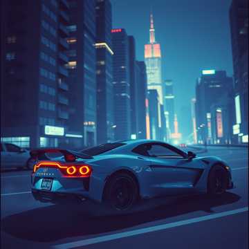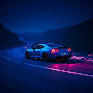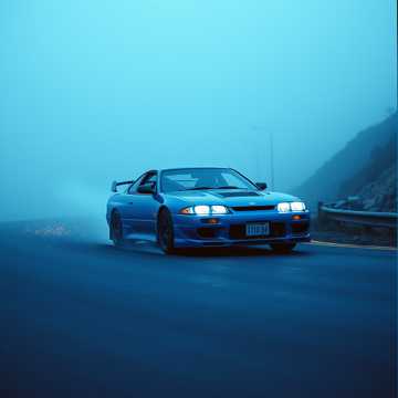 blue Nissan Silvia S15, female street racer, night mountain road, drifting, sparks from tires, motion blur, dynamic pose, wind blowing hair, neon lights reflection, racing suit, serious expression, cool attitude, foggy forest background, cinematic lighting, headlights on, glowing brake discs