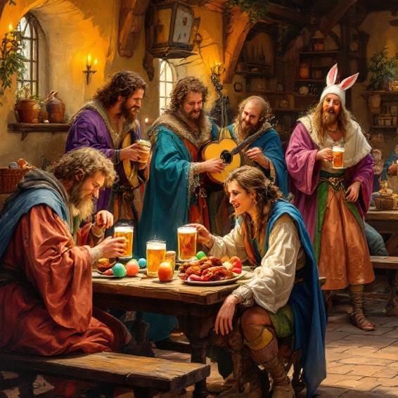 Medieval tavern, festive Easter egg hunt, minnesang vocals, lute, harp, flute, techno beat, handclaps, joyful crowd, playful melody, fusion of medieval and electronic, cheerful, danceable, springtime