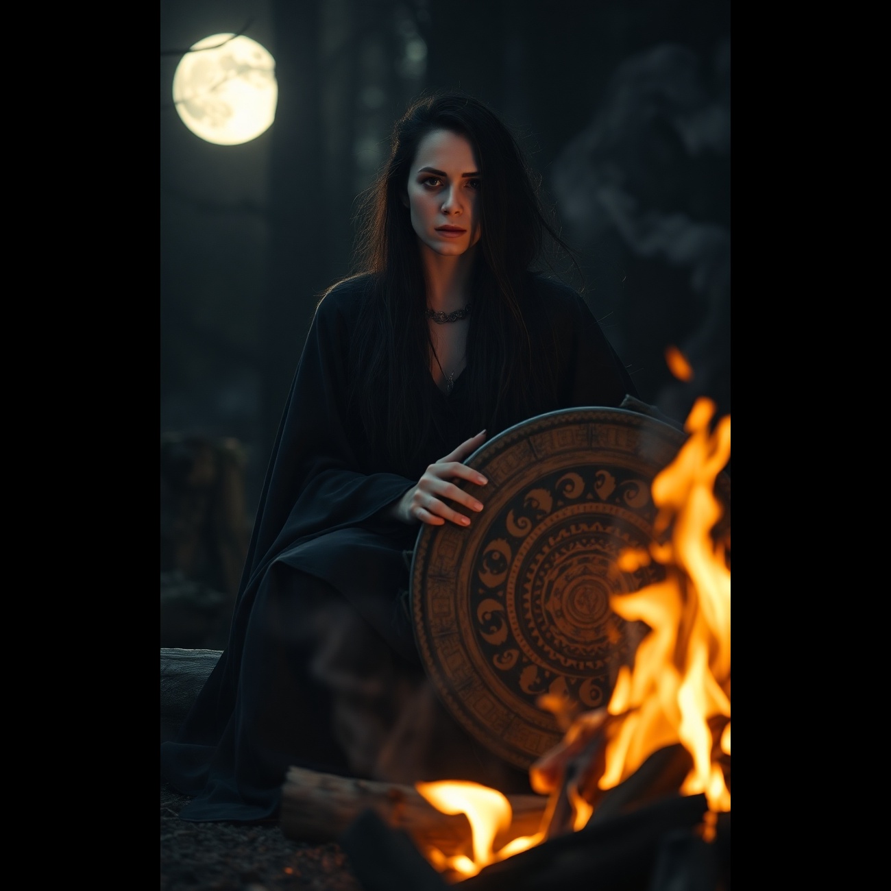 Create a dark ambient cinematic witch ritual spoken word song with a low female chest voice, warm dark timbre, layered vocals, and slow hypnotic tempo at 60 bpm, Use dark drones, deep sub bass, crackling fire sounds, distant thunder, shamanic frame drum, soft reversed piano notes, and subtle wind chimes to build a ritualistic, immersive atmosphere, Add deep reverb and echo to vocals, creating a mystical and empowering presence, as if a warrior witch is speaking under the moon by the fire, Structure includes an atmospheric instrumental intro, layered chest voice verses, soft instrumental pauses after the chorus for breathing, and a cinematic outro with wind chimes and low drones, The mood is cleansing, spiritual, empowering, dark, and warm, fitting for a night ritual of transformation and letting go of the past while claiming inner power