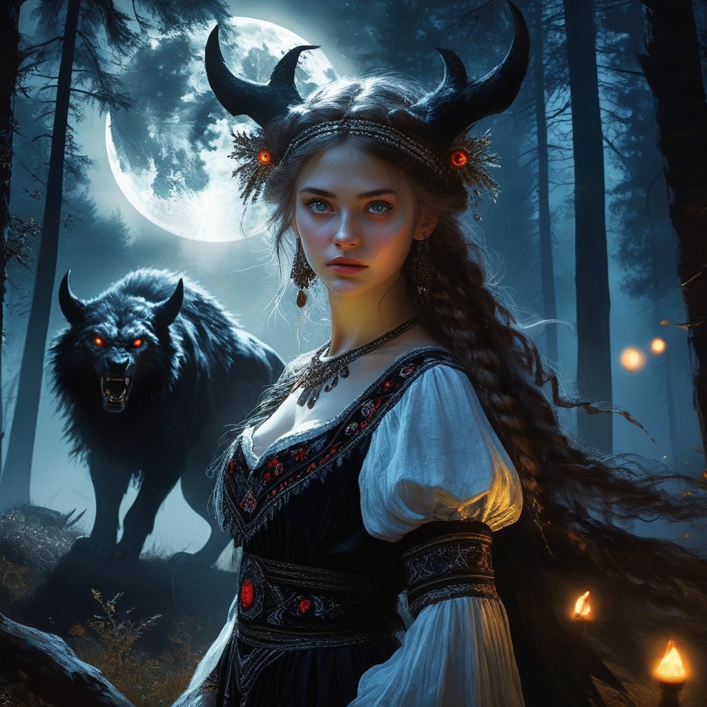 Dark psytrance 128 BPM in D-minor, Russian female witch vocals, tribal drums, distorted reese, ethnic flute, cinematic tension, huge drops, mystical atmosphere