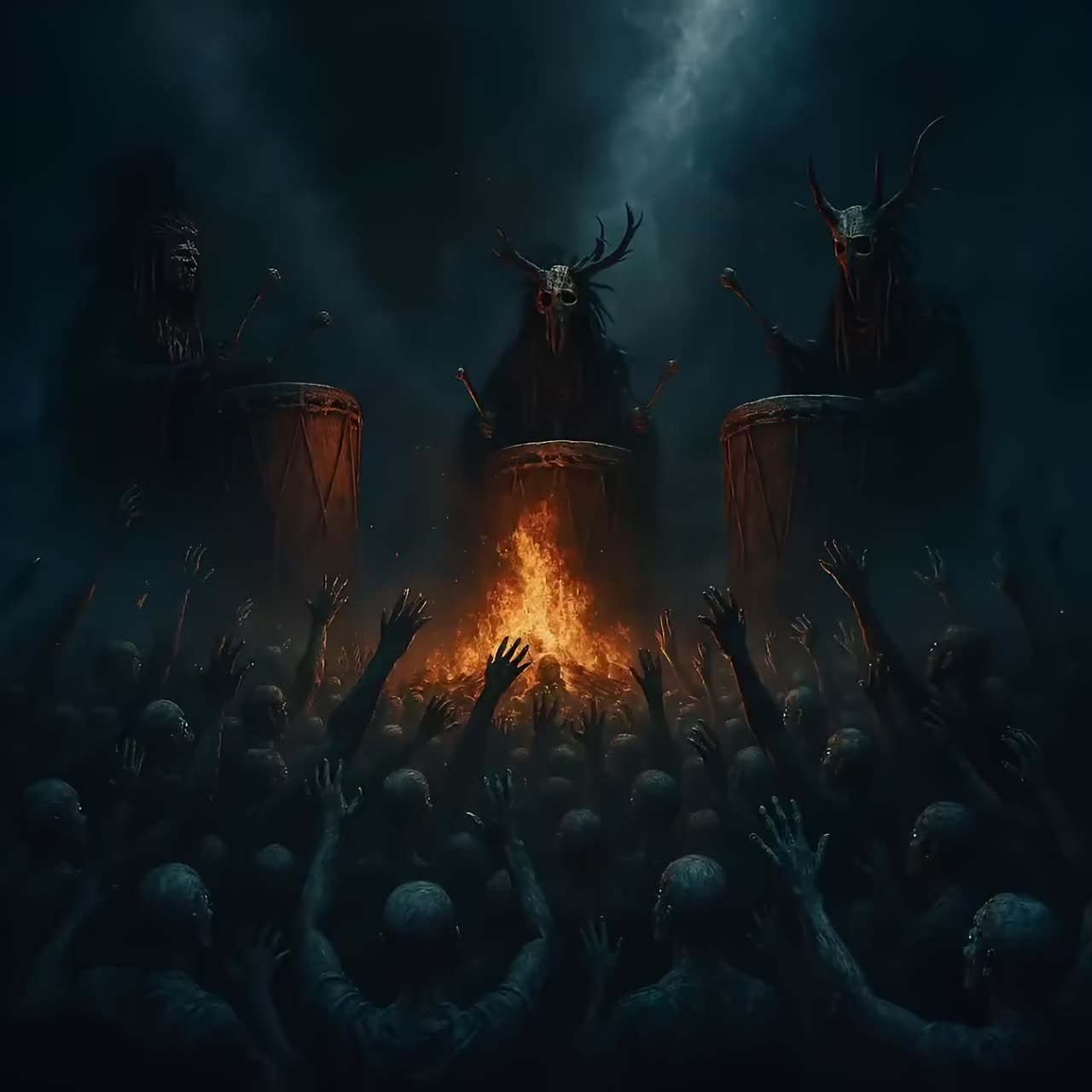 Deep tribal house track, hypnotic and dark atmosphere, 122 BPM, deep bassline, shamanic totem drums, organic percussion, ritual chants, mystical female whisper vocals, minimal melodic synths, underground club vibe, burning tribal fire atmosphere, hypnotic groove, powerful drop with tribal drums and deep sub bass, cinematic build-up, spiritual but slightly dystopian mood