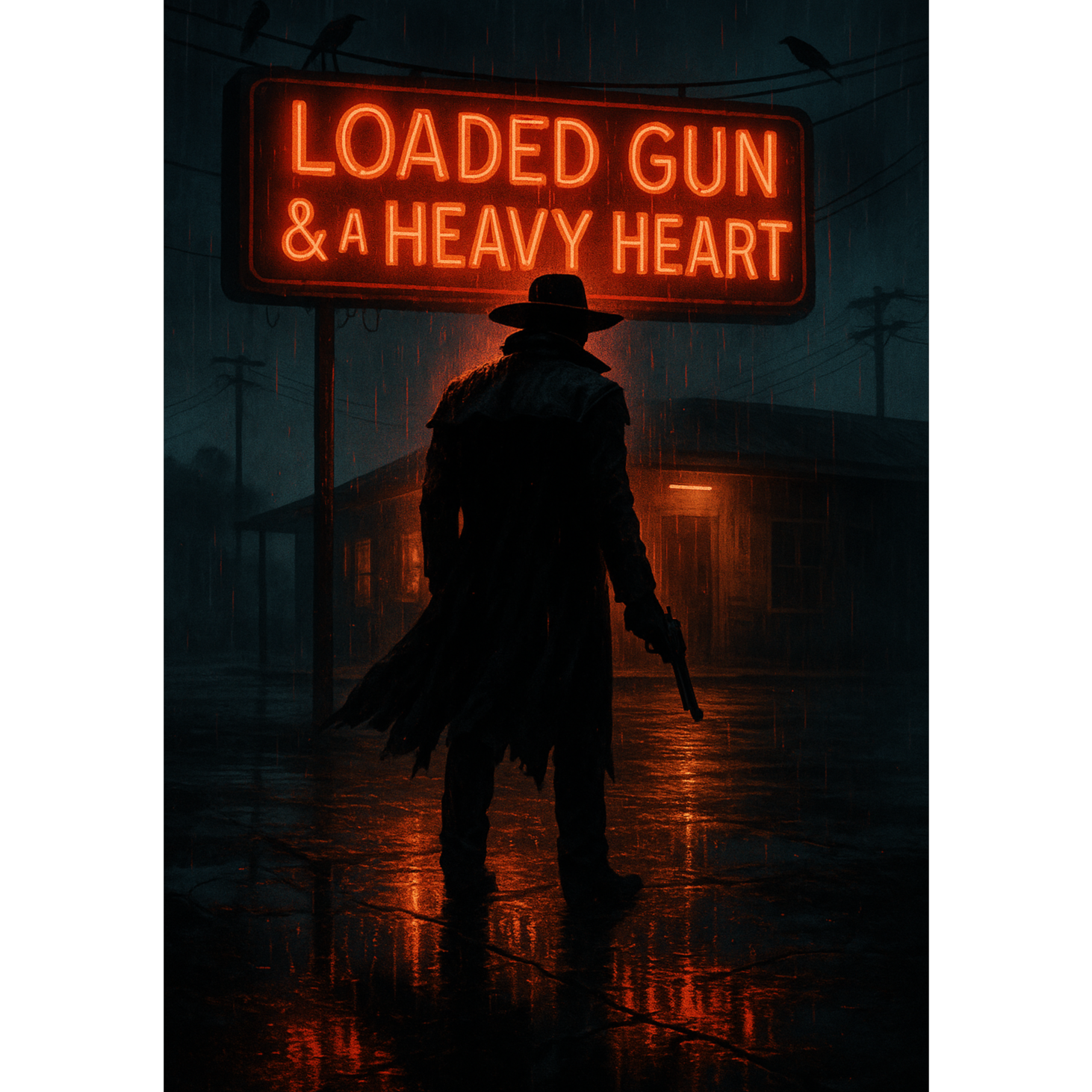 Dark country with a rugged Americana base: dusty slide guitars, stomping kick drums, and a twangy, outlaw mood, Layered with haunting ambient synths and pulsing EDM textures that build into drops during key moments (chorus, final bridge), Vocals have grit and swagger, with tension rising throughout, Imagine a thunderstorm rolling in over a ghost town, crackling with analog synth energy