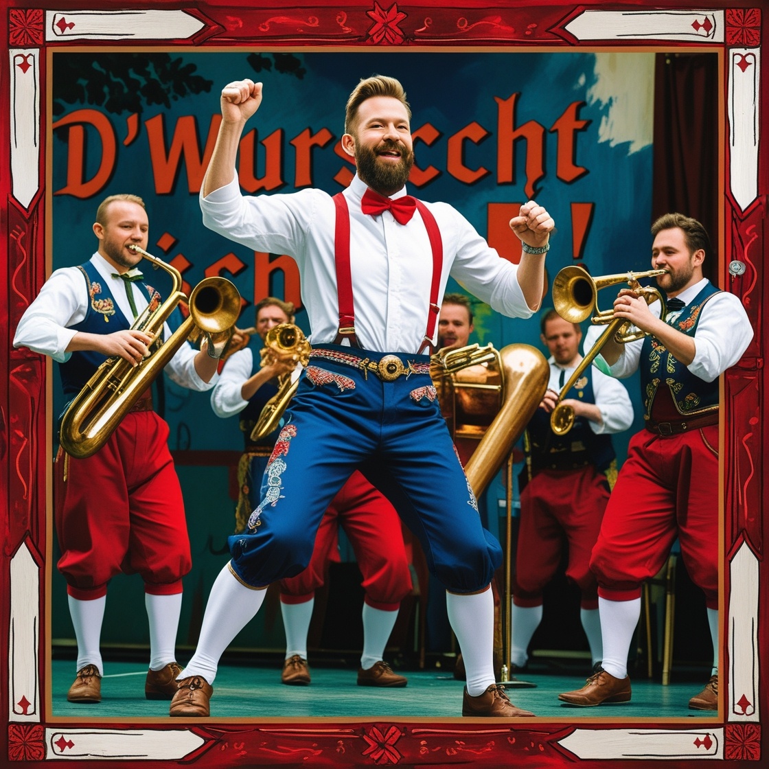 The song bursts in with lively accordion riffs, bouncing tuba basslines, and snappy, syncopated drums driving a classic Bavarian-German polka rhythm, The brass section adds color between verses, while call-and-response folk vocals in Alemannic dialect spark comedic interplay, channeling a festive beer tent atmosphere with playful instrumental breaks and spirited energy throughout