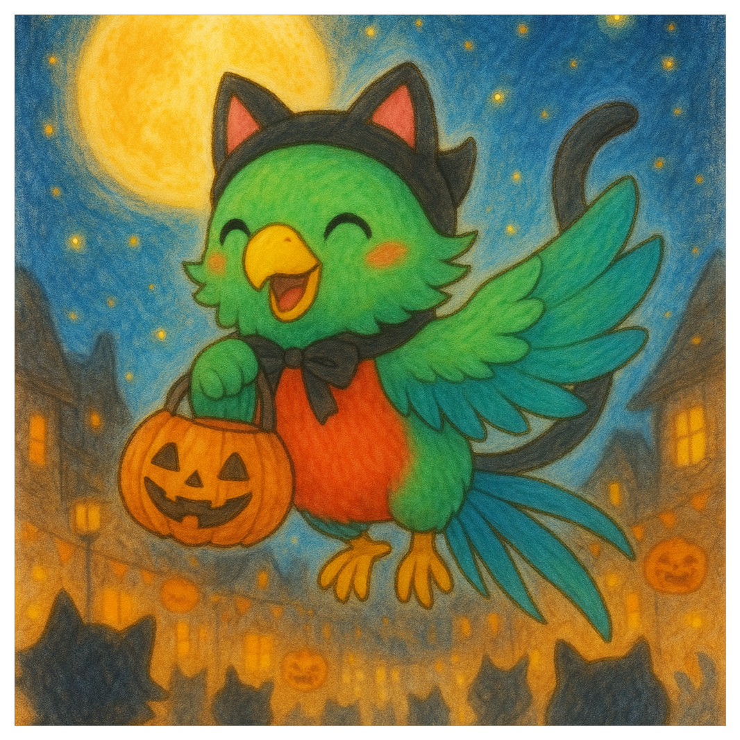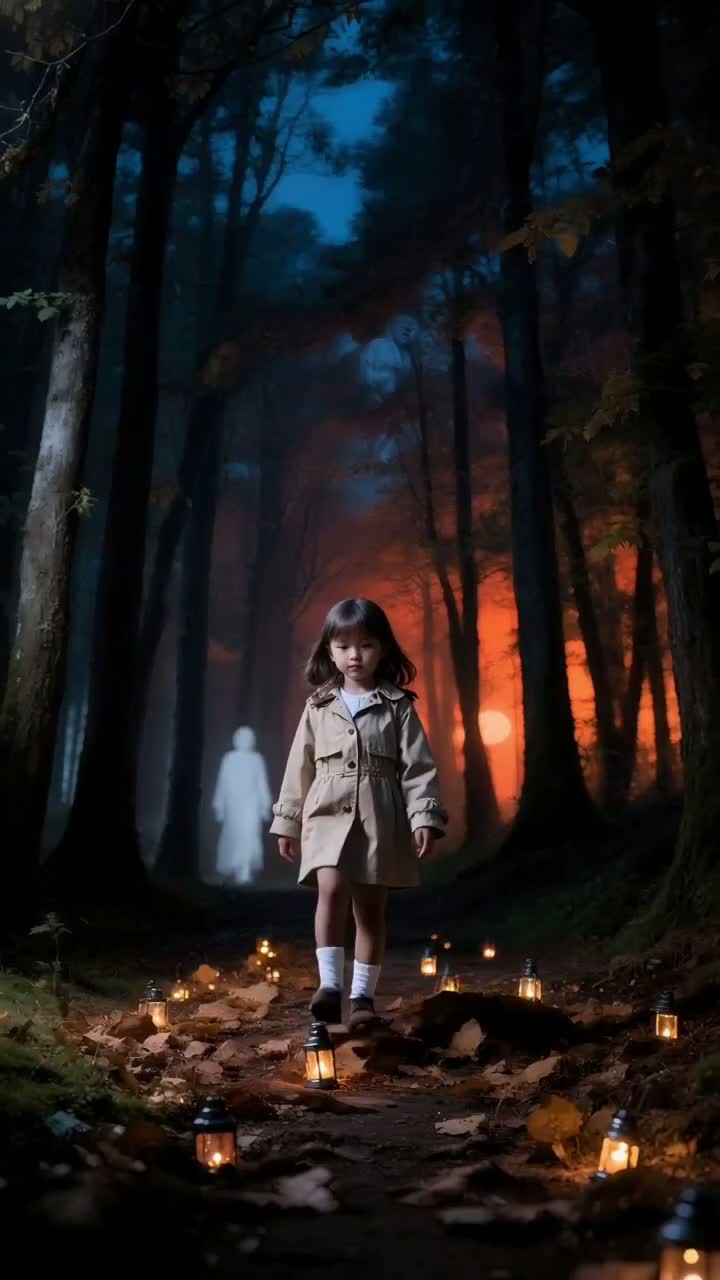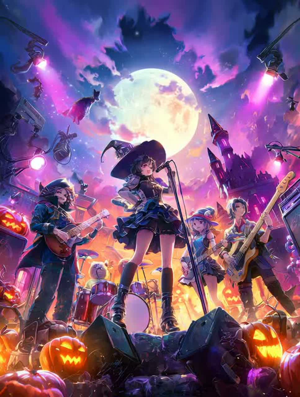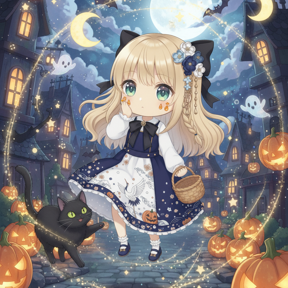 Genre: Dreamy J-pop à Orchestral Electronica (Halloween night train), Tempo: 82 BPM, D Lydian â E Mixolydian, Instruments: celesta, glass harmonica, soft strings, nylon gtr, tsymbaly (shimmering arpeggio), marching snare, warm sub-bass, tiny bells, FX: tape flutter, long shimmer, gentle child-friendly glitch, granular station whispers, train-wheel foley, Vocal: gentle female + distant kids choir, Mood: âTrick or truth?â, lanterns fade, secrets become stars; comet ticket, destination = dream; end on add9 glow