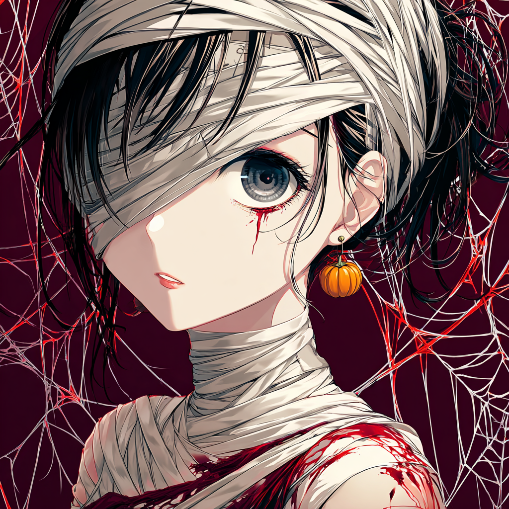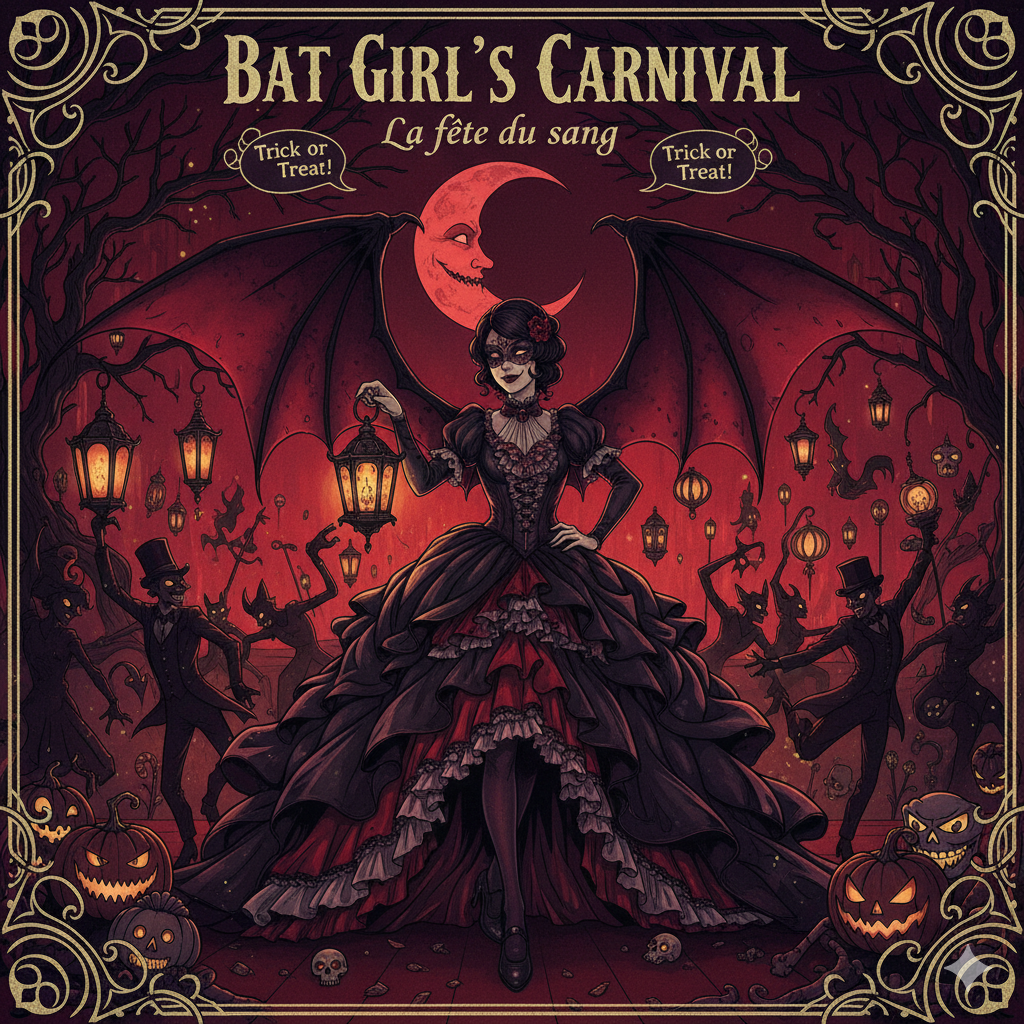 [Atmosphere: Whimsical yet sinister Halloween carnival, blending sweetness and menace, evoking a mischievous âbat girlâ luring the audience into a surreal masquerade]