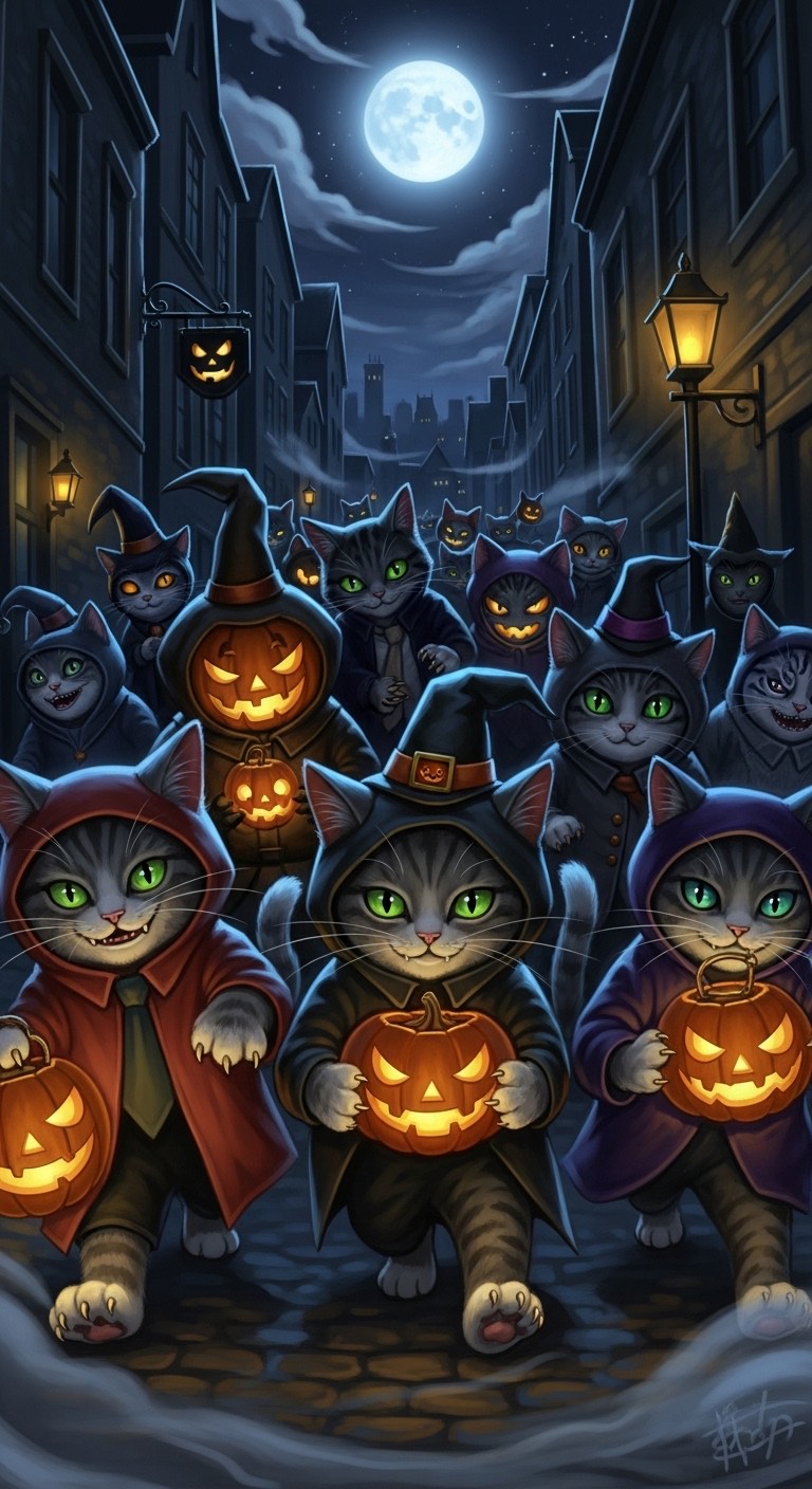 Mood: Cute yet eerie, mischievous 60% : dark/kingly 40%, cats taking over the night with playful pranks and subtle horror