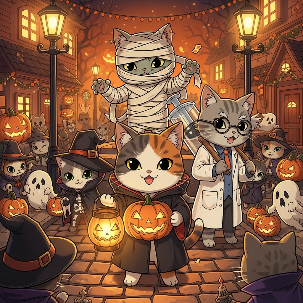 Celtic pop swing Halloween jazz parade, 120 BPM (±2), 4/4, A minor, Structure:[Intro][Verse A][Hook][Verse B][Bridge][Chorus][Outro], Mood:cute yet smoky;bar jazz meets midnight carnival, Vocal:bright female lead;playful phrasing;ânyaâ ad-libs;light scat;hook as swing chant, Groove:swung 8ths;bodhran + brushed snare;upright bass;ride cymbal shimmer;ghostly stop-time hits, Instruments:piano comp (7th/9th);muted trumpet;tenor sax lead;clarinet counterline;fiddle/whistle Celtic color;vibraphone;handclaps;bells, Harmony:minor tonic;iiâV motion;Mixolydian lift (bVIIâI);Bridge borrows iv, SFX:bar ambience, ice clink, faint wind;parade drums and church bell join;distant organ gives graveyard tone, Theme:a fluffy stranger joins costumed cats for a Halloween jam in a smoky bar;jazz and moonlight blend into the parade, Mix:intimate stereo room;horns wide;sax right, trumpet left;bells swirl rear, Loudness:LUFS -9;warm analog feel, End:tempo +3;final ânya-hoo!â with church bell fade