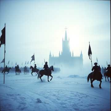 Compose an epic power metal track inspired by historical battles, Use fast tempo (≈150 BPM), heavy distorted guitar riffs, double‑kick drums, and symphonic orchestration with strings and brass, Vocals should be a commanding male baritone with choral backing in the chorus, evoking a war chant, The song should build tension from verse to chorus, symbolizing a point of no return, Theme: courage, destiny, and crossing into the unknown, ”