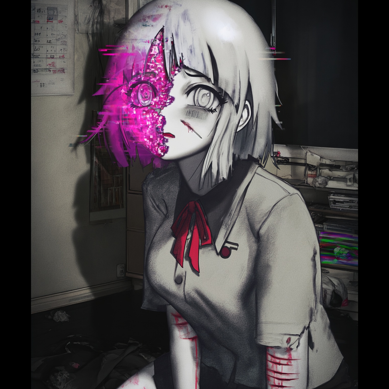 The track launches with frenetic breakcore drum patterns and glitchy cuts, punctuated by hyperactive lolicore samples, processed laughter motifs, and improvisational drum-kit fills, Layers of web-core synths and crushing dnb rhythms drive momentum, Kick is massive, with a focused high bass; mid-bass is lightly rolled off for clarity, allowing glitch and playful hopeful melodic fragments to dart through the texture, Sudden tempo shifts and digital artifacts keep energy unpredictable and uplifting, Rotcore, Vermin, Depressing, Sampled, Nostalgic, ‑-IDM, ‑dnb