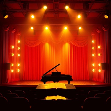 Broadway musical opener, theatrical style, fast-paced, ensemble cast, brass section, high energy, orchestration, dramatic, storytelling