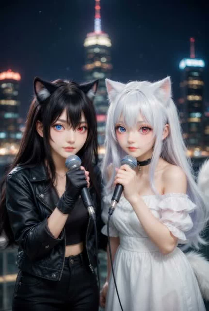 stylish, mysterious, neon night city, black and white duality, playful but cool, elegant tension, dramatic release