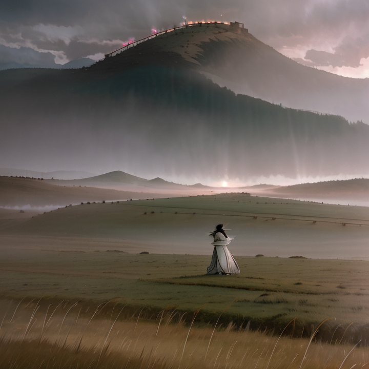Fantasy-inspired slow folk ballad with soft ethereal female vocals, layered vocal harmonies in chorus, acoustic fingerpicked guitar, ambient synth textures, occasional flute melodies, distant wind sound effects, cinematic reverb and soft percussion, Emphasis on emotion, melancholy, and mystical atmosphere
