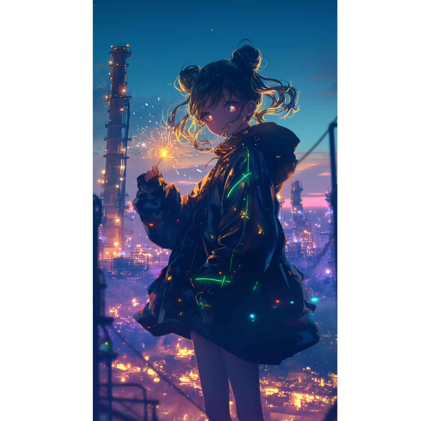 Female JP vocal; ambient-industrial downtempo ~90 BPM in D# minor with abrupt genre flips, Theme: sparkler after night-shift in chemical plant—quiet grit vs colossal machinery, Intro: distant metal drones, hydraulic hiss, FM-radio static, Verse: airy pads, low-cut guitar; drums from valve clicks, pipe knocks, breaths, Bar 17: shift to 5/4 glitch-hop, detuned toy synth + koto plucks, snap back to 4/4, Pre-Chorus: warm sub-bass, reversed-cymbal swells, Chorus: wide stereo, shimmering saw pad, small choir, sparkler-crackle hi-hat, 2nd Verse: modular bass growls, random filter sweeps, Bridge: near-silence—hiss, heartbeat kick, whispered ad-libs—then 2-bar 175 BPM drum’n’bass burst that evaporates, Outro: FM-bell arpeggio melts into industrial clangs, final single crack, Mood: cinematic, bittersweet, daring, Mix: lush vocal reverb, crisp transients; master ≈ –13 LUFS