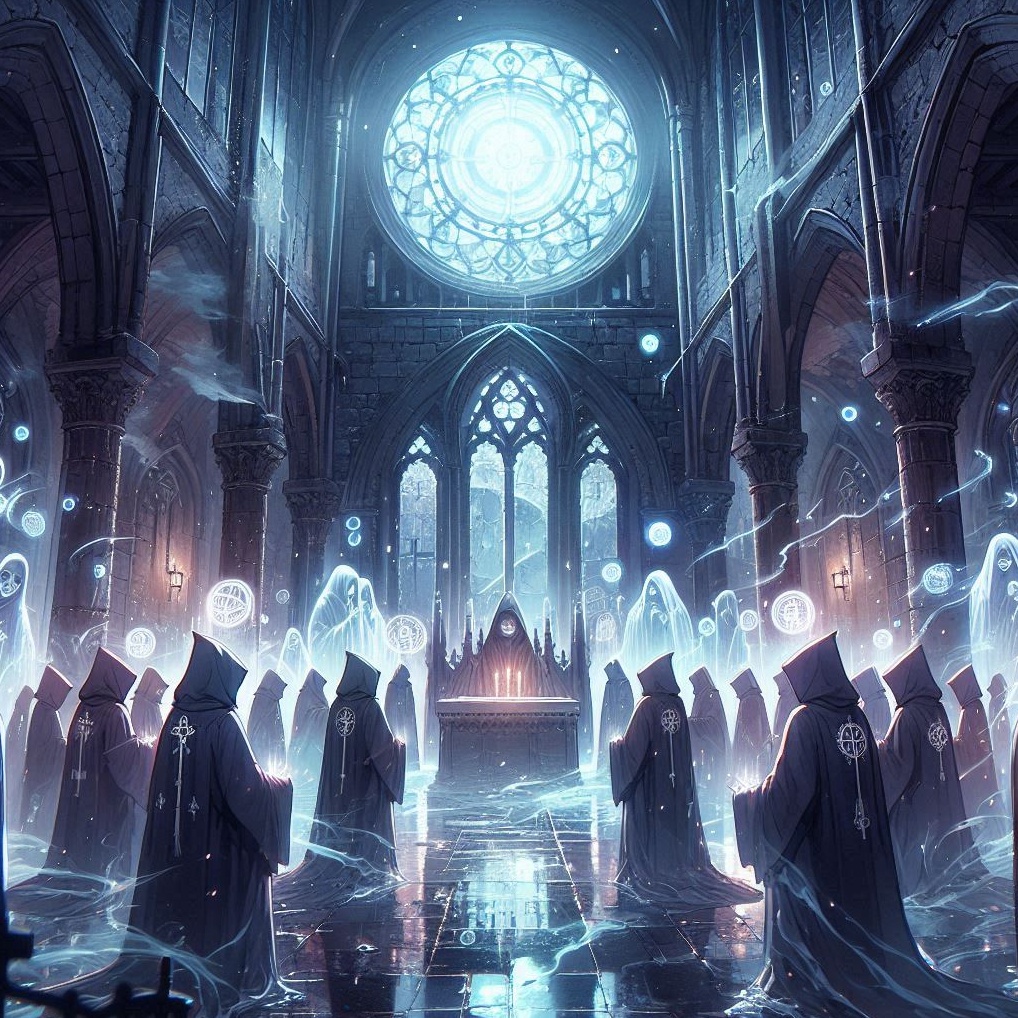 haunted atmosphere, K-pop, jpop, dark pop, ethereal, gregorian chant, supernatural, ghostly echoes, Monastic horror