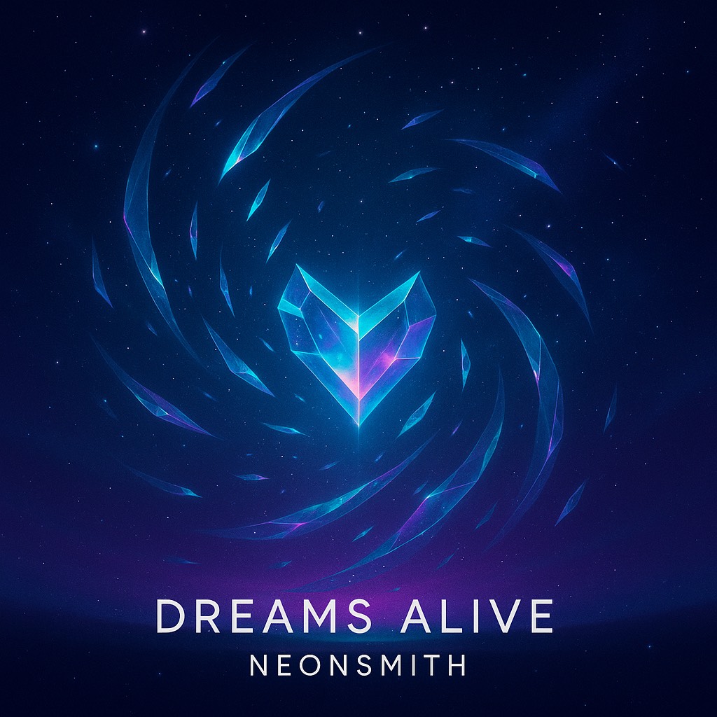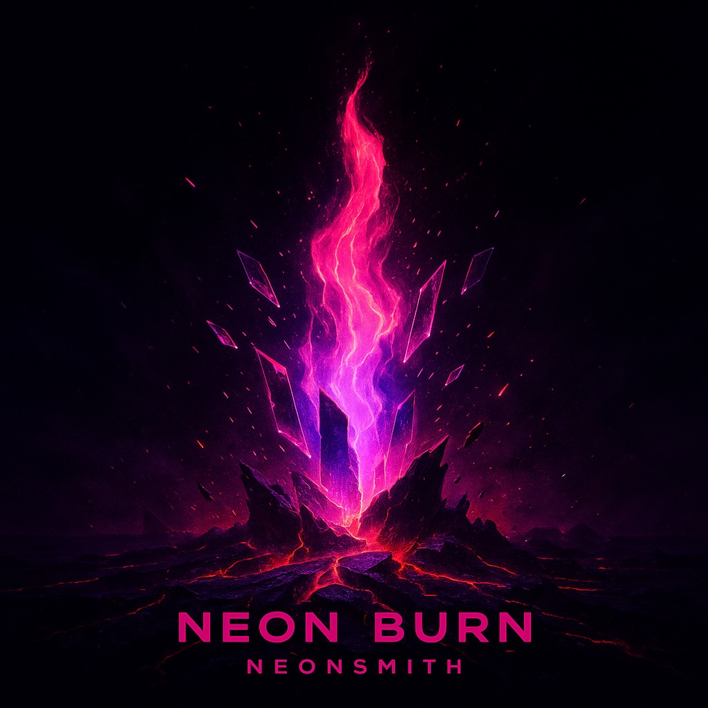 Euphoric house anthem fused with synthwave, Female vocals soar with emotional power, delivering short, chant-like lines that repeat for maximum impact, Verses build with tension, pre-chorus lifts, and choruses explode into massive drops, Four-on-the-floor beat, pulsing bass, wide retro pads, and shimmering neon arpeggios create a cosmic, radiant wall of sound, The mood is uplifting and mythic — blazing hearts burning forever under neon skies