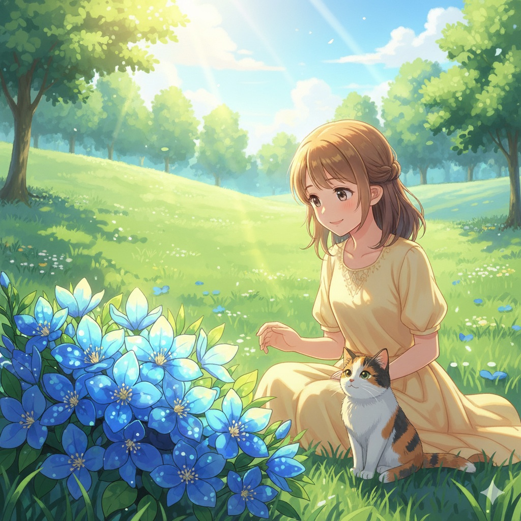 A warm and heartfelt pop-reggae ballad symbolizing hope and rebirth through the blue blossom of the Lignum Vitae, Jamaica’s national flower, Blend 80s Japanese pop tenderness (Japanese City Pop style) with gentle island rhythm and acoustic soul textures, Use acoustic guitar, Rhodes piano, upright bass, light percussion, steelpan highlights, and lush vocal harmonies, The arrangement should feel airy and organic, evoking the soft breeze and resilience of island life after hardship, The female vocal should be gentle, expressive, and comforting, conveying quiet strength, empathy, and emotional warmth rather than overt power, The song expresses quiet strength, community, and the healing power of nature, like the blue flower blooming again after hardship, a message of renewal and shared love that bridges Japan’s softness with Jamaica’s soul, Genre: Japanese Soft City Pop × Roots Reggae Soul