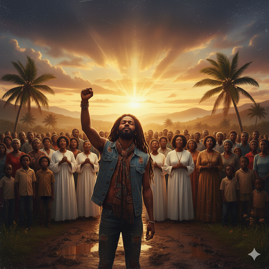 Reggae, gospel, male vocals, Bob Marley's style, uplifting, powerful, anthem of hope, soulful, strong female gospel choir, Hammond organ, horns section, one-drop rhythm, resilience