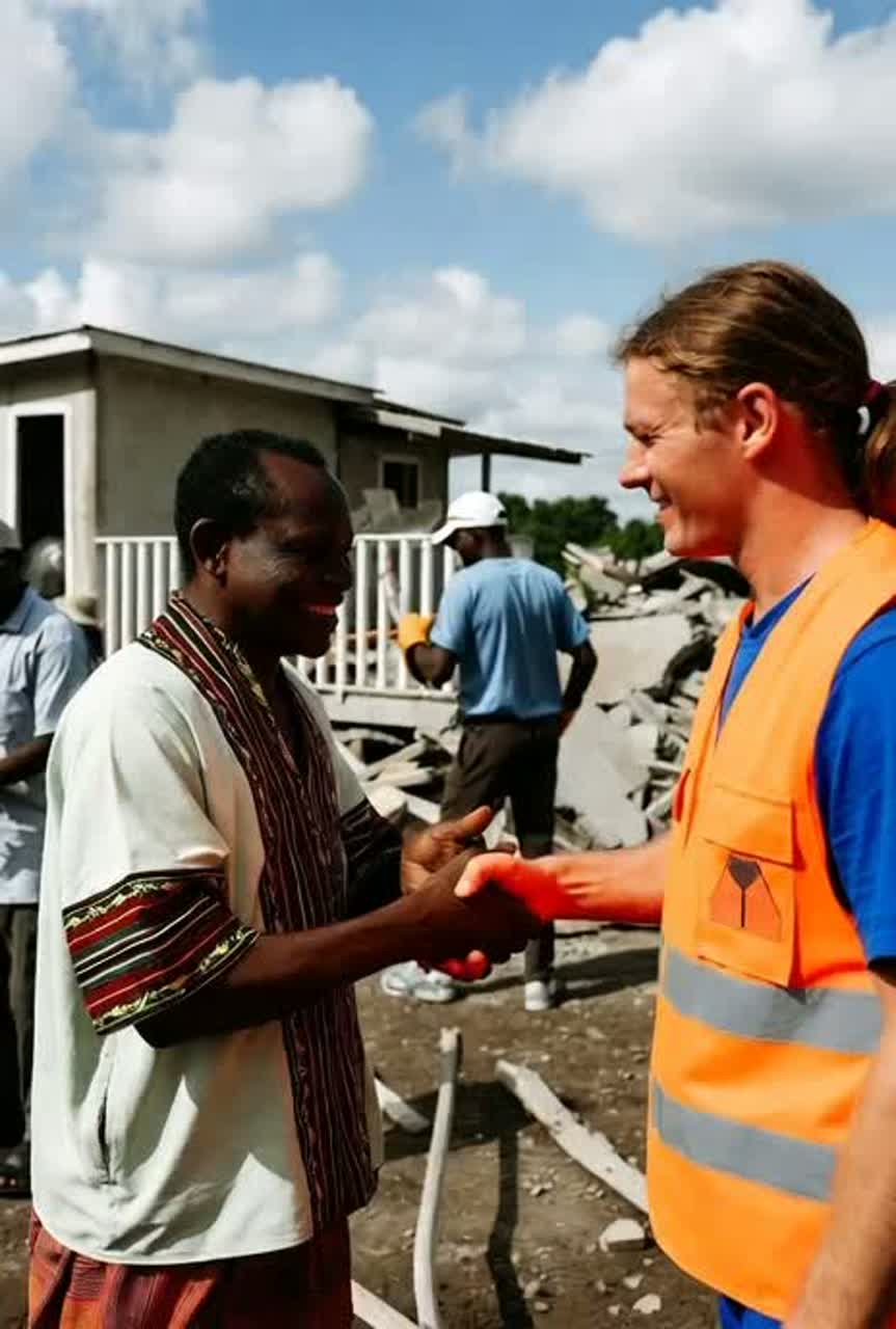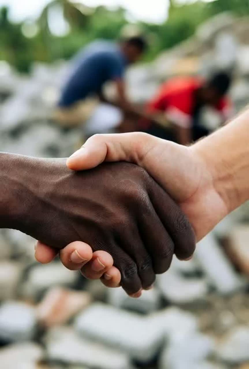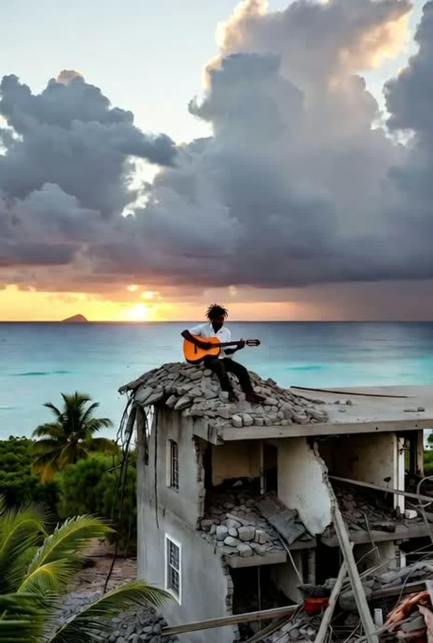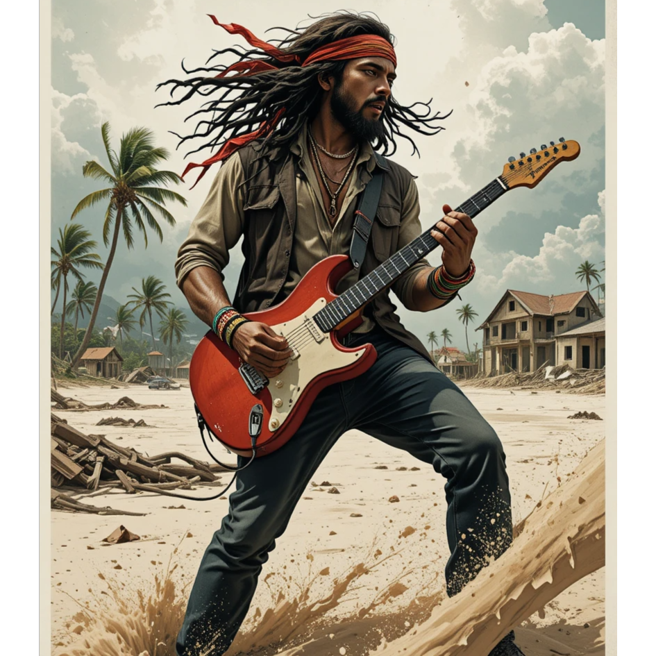 Roots Reggae × Emotional Caribbean Soul | Tempo: 76 BPM | Key: G major | Energy: steady groove → uplifting → soulful fade | Feel: warm analog tone, live-band session vibe, relaxed swing rhythm | Vocals: deep soulful male lead with classic island phrasing, rich harmony trio ±40° pan, natural dynamics, plate + hall blend reverb (3–5 s) | Instruments: Fender Jazz bass (90–120 Hz center), sskank guitar L40°, Hammond organ R40°, rimshot snare reverb 2 s, tambourine ¼ beat, light brass pad behind organ | Mix: 8D binaural space rotation 0, 2 Hz, stereo width 190°, analog saturation 1, 5%, compression 2, 5:1, –8 LUFS target | Ambience: live room reflections 25%, crowd claps diffuse 1, 3 s, vinyl hiss –30 dB for warmth | Mood: hope after disaster, unity and healing through giving, compassion and solidarity across islands | Production Goal: immersive 8D roots sound with world-class studio quality, organic warmth, and emotionally uplifting spirit, high quality, world-class studio production