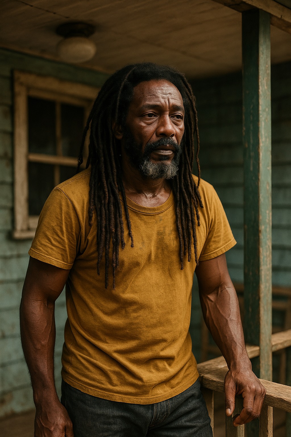 soulful roots reggae with cinematic warmth, male vocals rich and textured, deep emotional tone, slow uplifting groove with live drums, warm bass, organ, and nylon guitar, extended instrumental breaks with brass and percussion fills, 88 BPM in G major [organic analog mix] [warm island sunlight tone] [community spirit] [slow breath phrasing] [hopeful rebuild energy]