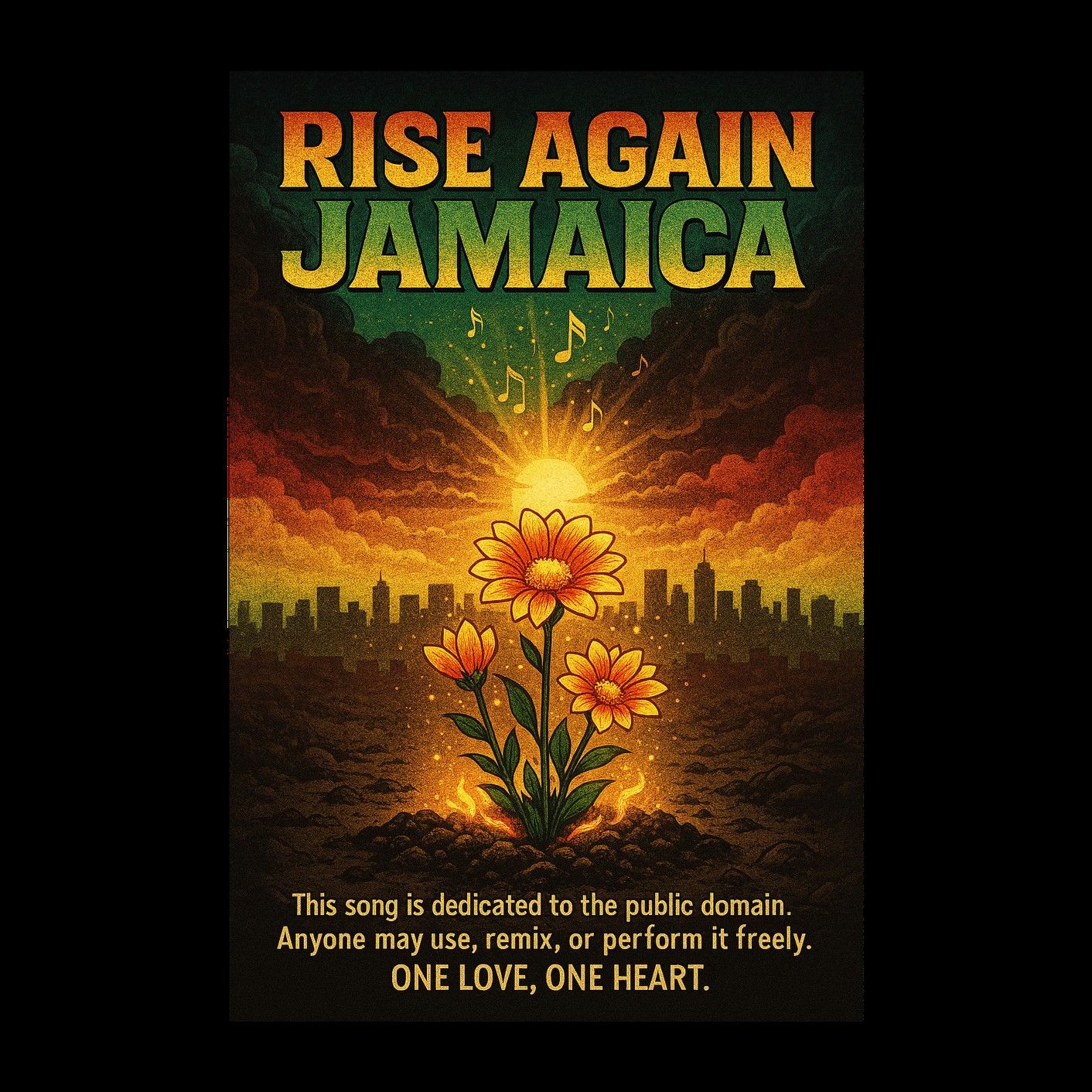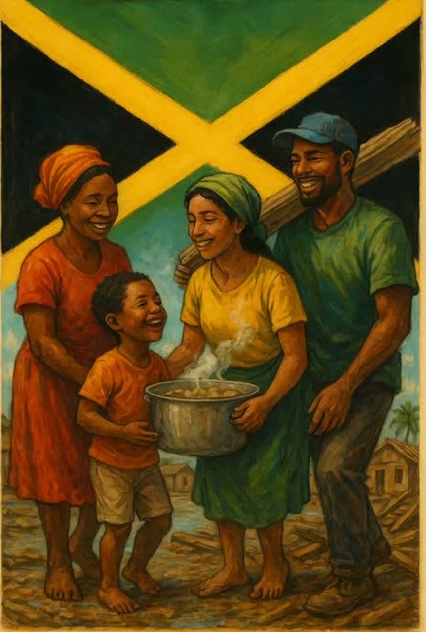 Reggae-inspired cinematic pop anthem featuring soulful soprano female vocals with warm harmonies and uplifting energy, Key of C Major chosen for brightness and hope, Arrangement blends traditional reggae rhythm (offbeat guitar accents, bass groove, and laid-back drums) with cinematic strings and choir elements for emotional depth, Verses carry storytelling warmth about community and resilience, while the chorus swells into a unifying anthem celebrating Jamaican strength and spirit, Bridge introduces choral harmonies and acoustic instrumentation for heartfelt reflection before the final, powerful reprise, Production balances roots reggae authenticity with modern pop clarity — steelpans, rhythmic guitars, organic percussion, and layered vocal textures creating a sense of unity and renewal, Mood is hopeful, uplifting, and deeply emotional — a call for rebuilding, solidarity, and love