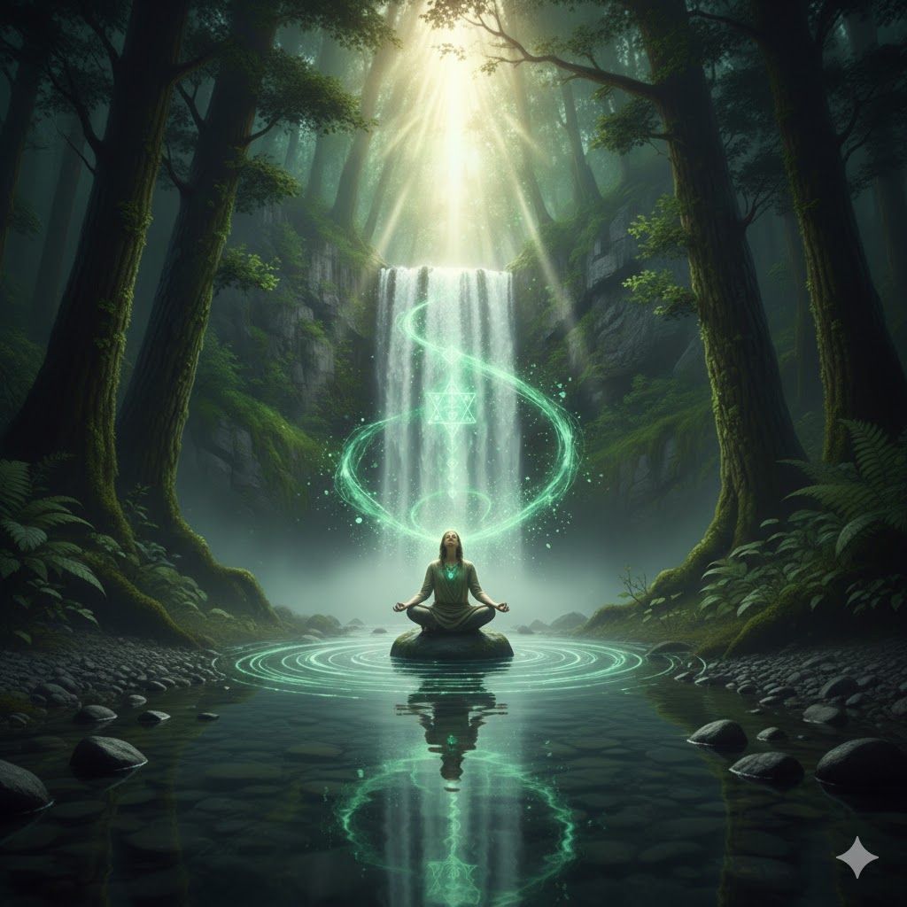 Pure nature sounds, steady green noise, high-fidelity waterfall rushing, wide frequency spectrum, no music, no melody, therapeutic focus frequency, organic white-to-green transition, no drums, ambient forest atmosphere