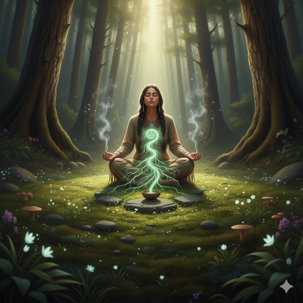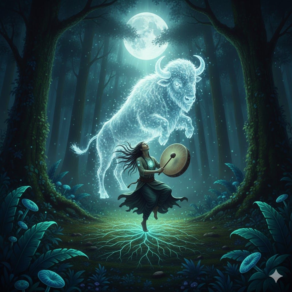 Cinematic Native American Ambient, 432Hz, Indigenous Ritual Percussion, Deep Buffalo Drum Heartbeat, Rhythmic Medicine Rattle, Earthy Green Noise, Organic Wood Textures, Spatial 3D Audio, 60 BPM, Ceremonial Grounding, No Vocals