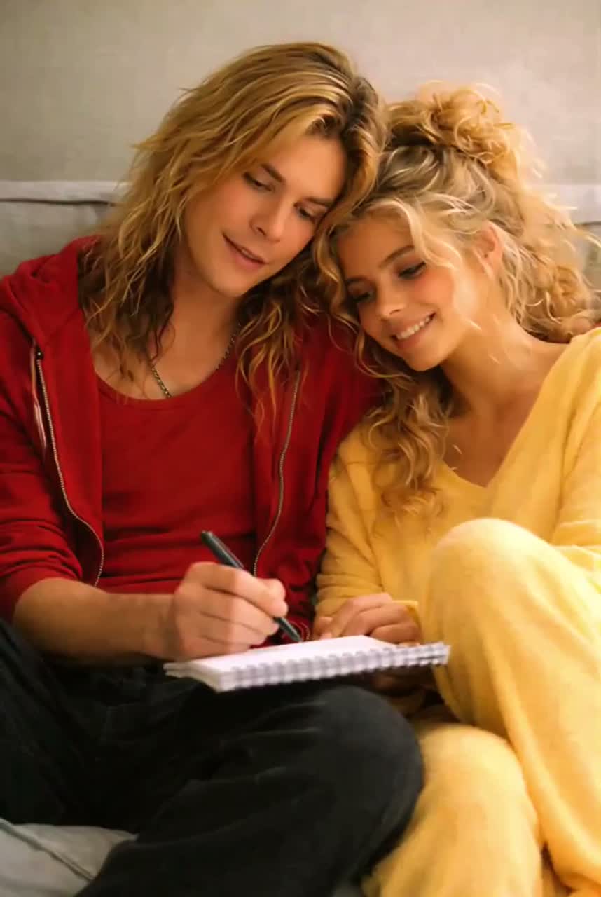 Tender but confident — romantic without being cheesy, Rhytm Acoustic guitar in The Style of Izzy Stradlin carrying verses, Clean Lead guitar in the Style Of Slash with chorus effect, Emotional guitar solo melodic, singing tone, not flashy, Warm bass, smooth and melodic in The Style Of Duff Mckagan, Soft rock drums brushes/light hits at first, fuller later in The Style Of Tommy Lee, Mood & Theme : Cozy, romantic, handwritten lyrics, soft glam, warm hearts, songwriting love, safe place, together forever, Cozy, romantic, intimate, Songwriting sessions at home, Love, trust, warmth, togetherness, Soft smiles, notebooks, acoustic guitars, cuddling on the couch, Safe place energy — hearts