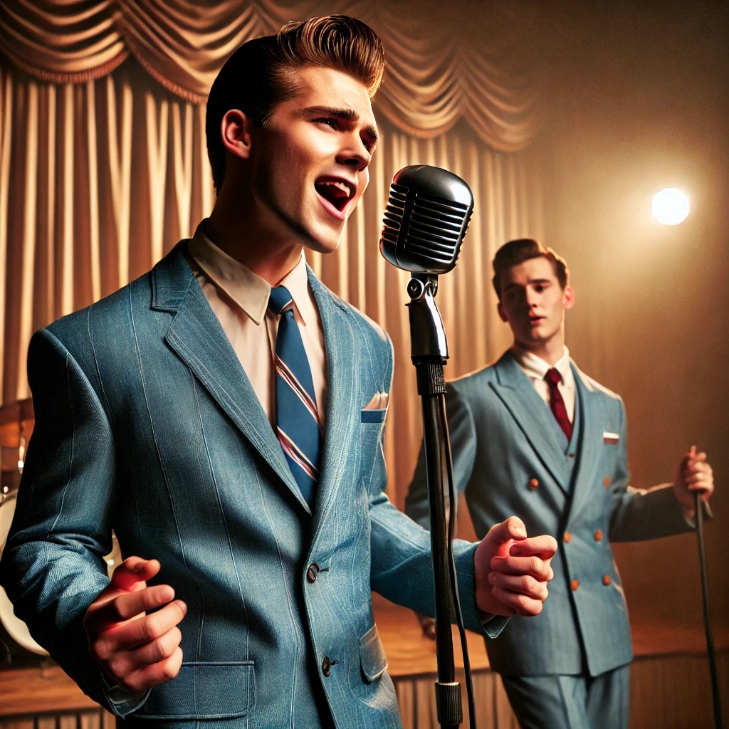 60's rock and roll, doo wop, catchy, young edgy male vocal, barbershop quartet, snapping fingers, saxophone