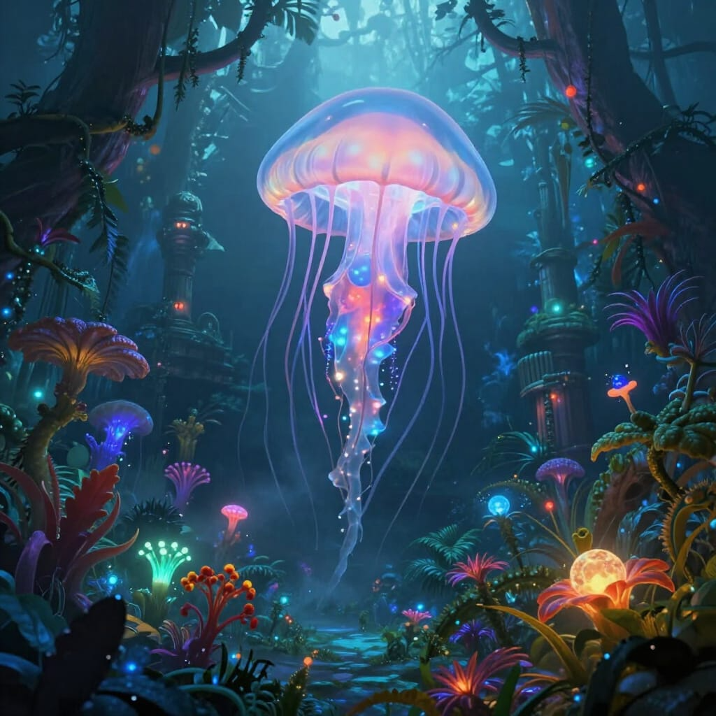 A hypnotic Psytrance and Dubstep hybrid built around mantra-driven vocal repetition and surreal space imagery, The track unfolds as a controlled long-form journey, using Psytrance as the rhythmic spine and Dubstep as intermittent pressure and impact, Orchestral and cinematic textures emerge subtly, while bass design shifts between rolling psychedelic motion and heavy, restrained drops, Vocal phrasing emphasizes the words “space jellyfish” as a central hypnotic trigger, delivered with clarity, repetition, and spatial movement rather than narrative storytelling, The arrangement prioritizes flow, trance induction, and gradual escalation, allowing tension to build and release in waves without panic or chaos, The overall tone is surreal, playful, and immersive, drifting between calm detachment and rhythmic propulsion, ending in a spaced-out, denouement-style resolution