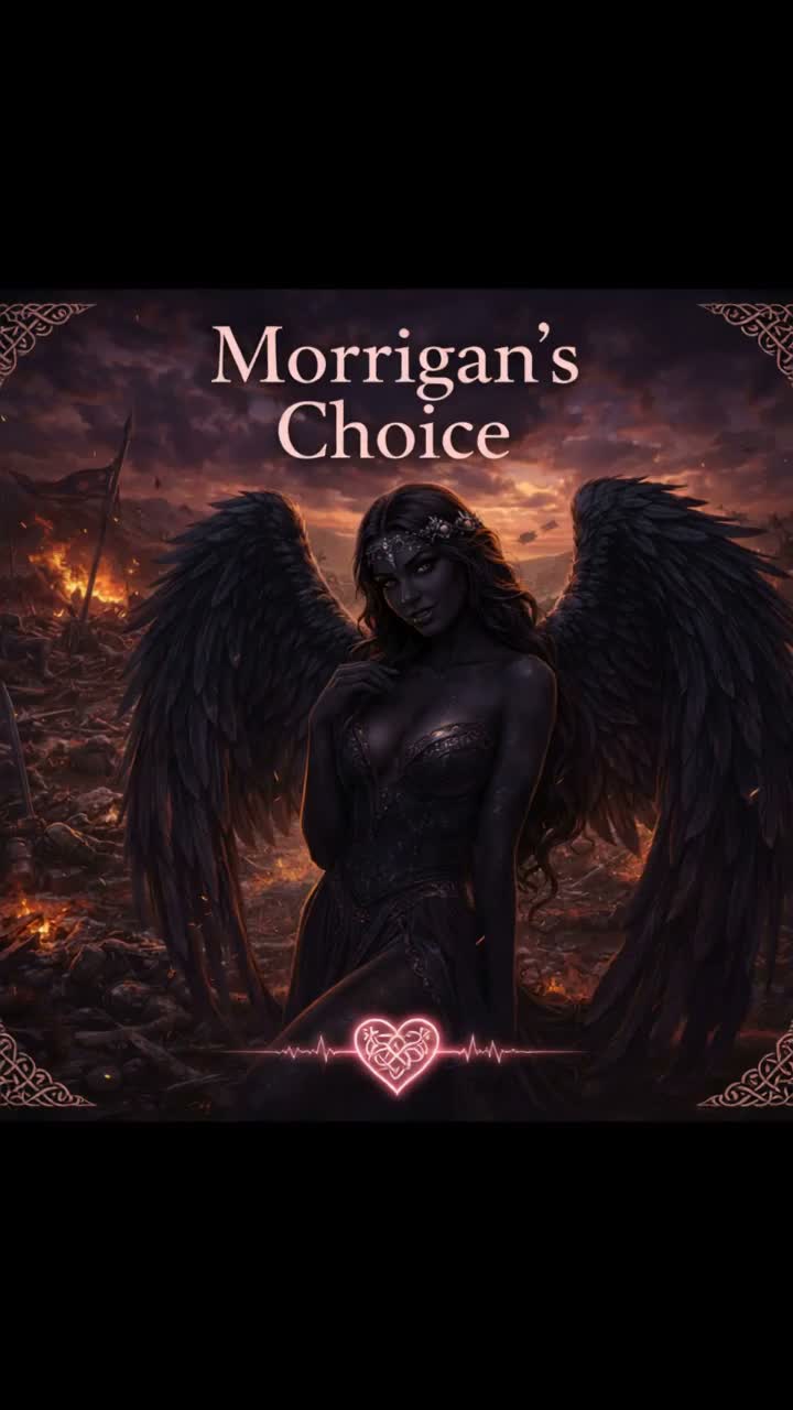 Dark emotional Celtic heartwave track with Irish tone, Tempo medium (100–115 BPM), steady, hypnotic rhythm, Style: blend of deep wave (soft bass pulses, ambient pads, subtle synth textures) with Celtic elements (acoustic guitar, slow fiddle, airy flute, distant reverb-heavy bagpipes), Mood: dark, mystical, seductive, tragic love bound to fate and death, Vocals: verses sung by a male lead with clear Irish tone (warm, slightly rough, expressive, natural Irish accent, emotional but controlled), Chorus: duet – strong emotional male lead (Irish tone) with soft, haunting, ethereal female voice, Female vocals ONLY sing lines in quotation marks, distant and echo-like, Chorus catchy but controlled, not loud, smooth layered harmonies, no aggressive drops, Structure: 2–3 verses + recurring duet chorus + atmospheric outro, Theme: The Morrigan, choice between love and fate, war, death, inevitability, Atmosphere: cinematic, reverb-rich, shadowy, smooth transitions