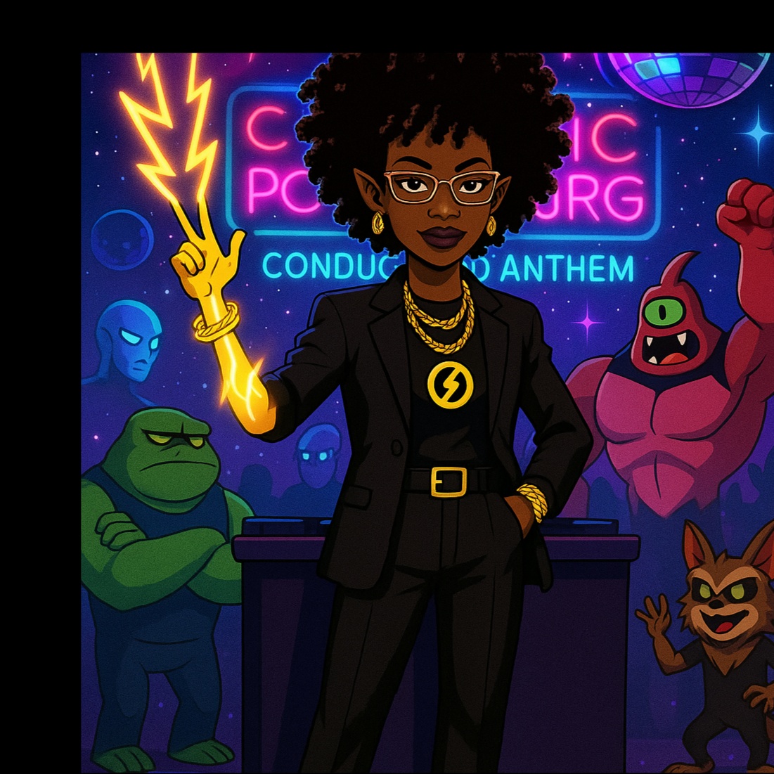 Explosive cosmic electro-funk fused with cyberpunk grooves at 124–128bpm, Robotic basslines clash with slap bass duels, syncopated glitch drums, chromatic synth stabs, and cosmic arpeggios, Sudden sync dropouts, arcade FX, and escalating swagger drive polished groove battles, Heavily-vocoded, crunchy male vocals—staccato commands, sarcastic taunts—layered with bitcrushed, formant-shifted “shadow” voices, stereo glitch tails, pitch-warped artifacts, call-and-response AI duels, and arcade vocal FX, Performed by N/0/LL