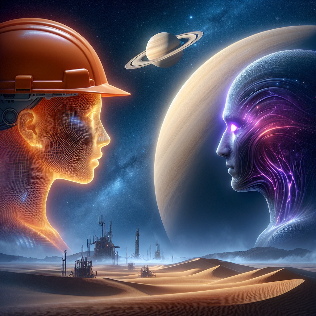 Prog metal, atmospheric metal, heavy guitar, heavy synth, female vocal, smoth robot vocal, Devin Townsend Project vibe, Ayreon vibe, cosmic, alien music, slow beat, guitar solos, synth solo, sci-fi