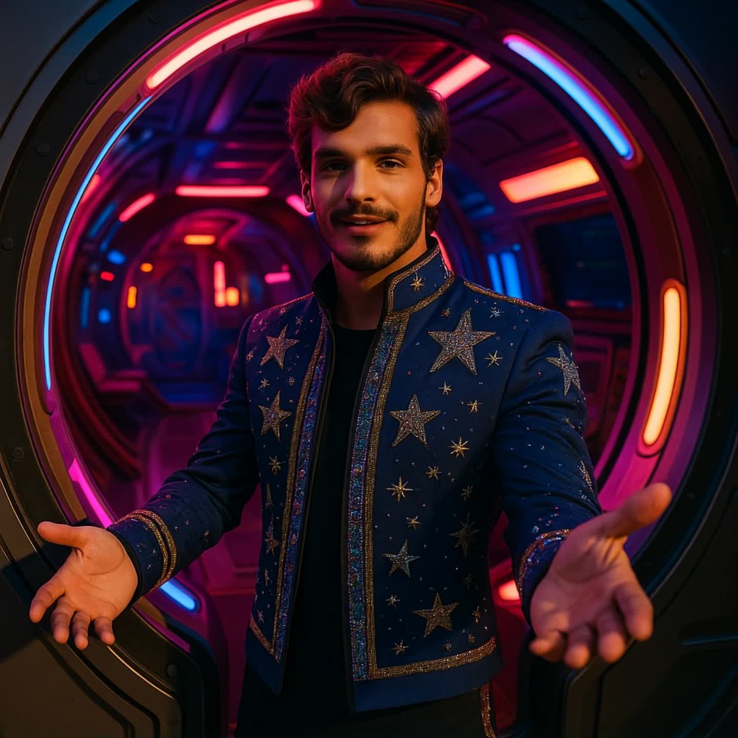 Male lead vocal, funky synth bassline, retro analog arpeggios, disco hi-hats, clean electric guitar with wah-wah, vocoder backing vocals, spacey synth stabs, four-on-the-floor beat, groovy claps, filter sweeps, cosmic risers, talkbox FX, shimmering pads, laser zap transitions, rhythmic glitch FX, bouncing sidechained synths, glitterball ambiance, interstellar breakdown, galactic lead melody, solar wind FX, upbeat tempo (125–130 BPM), retro-futuristic energy