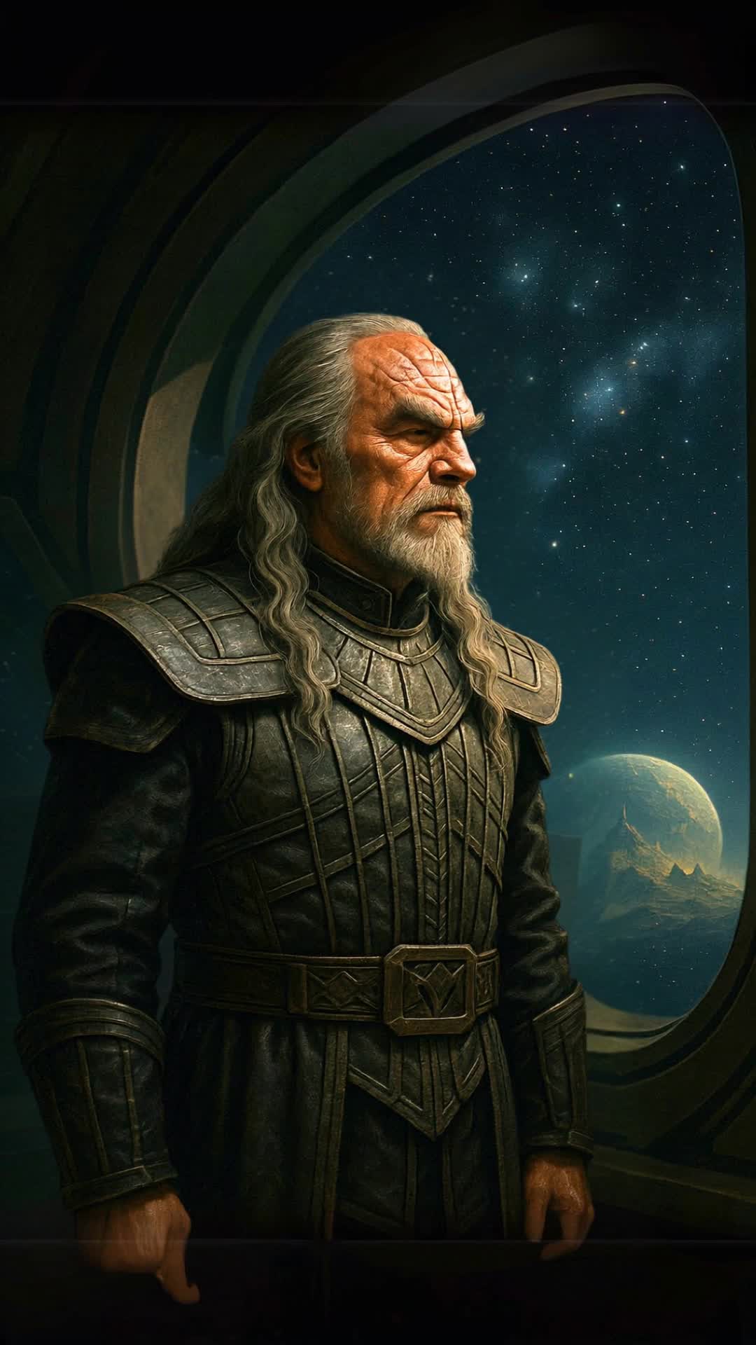 Klingon opera, dramatic, timpani, percussion, strings, harpsicord, dark strong male Klingon lead voice contrasted with a younger English male voice