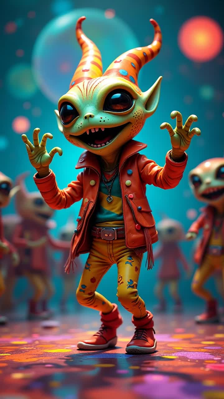 stars, opening with samba-electro percussion and glitchy neon synths over ambient crowd FX, The mood is electric, festive, and futuristic, Verses use a syncopated funk groove with vocoder-filtered lead vocals and basslines that slap like interstellar heartbeat, Pre-chorus adds filtered harmonies and rising percussive layers, The chorus erupts in hyperdisco euphoria with layered synths, 4-on-the-floor beats, and robotic gang vocals shouting the hook, Bridge transitions into an afrobeat breakdown with pulsing congas and a sensual whispered vocal line before slamming back into a final chorus, Feels like a rave on Jupiter — vibrant, kinetic, and euphorically alien